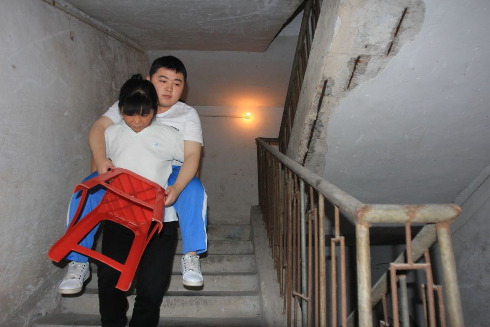 剛開始走不了路,陳斌自閉自卑!盀槲覀冇赂一钕聛(lái)好嗎?一關(guān)一關(guān)慢慢過(guò)!眿寢尷罨菰崎_導(dǎo)他,“讀書改變命運(yùn)。只要你想,我會(huì)一直背你上學(xué)!”走不了,媽媽成了他的腿;四肢無(wú)力,媽媽幫著挪動(dòng)按摩。