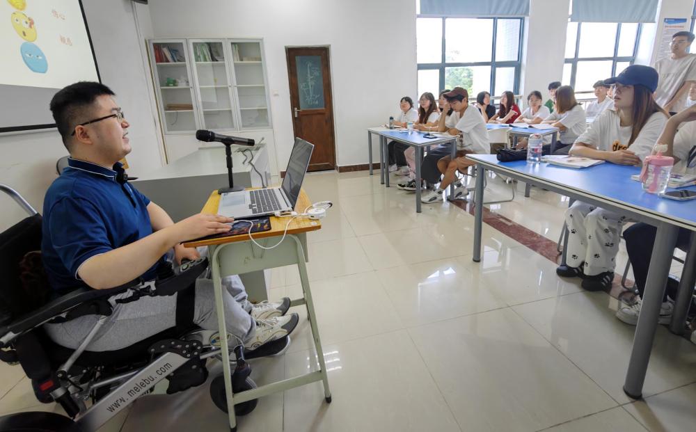 第一次面對(duì)學(xué)生,陳斌緊張了。坐在輪椅上的他,肢體語(yǔ)言不豐富,只能用實(shí)際內(nèi)容和口頭語(yǔ)言來(lái)吸引學(xué)生。