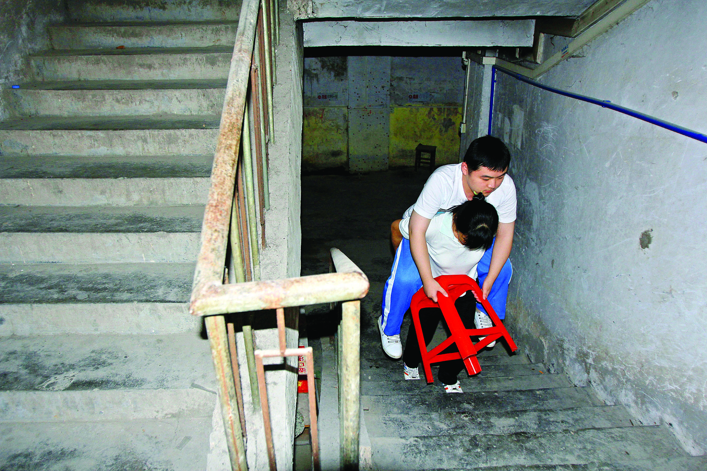 2012年7月9日,100多斤的李惠云背著120多斤的兒子陳斌艱難地爬樓梯,手中提的凳子可隨時讓陳斌坐下休息。