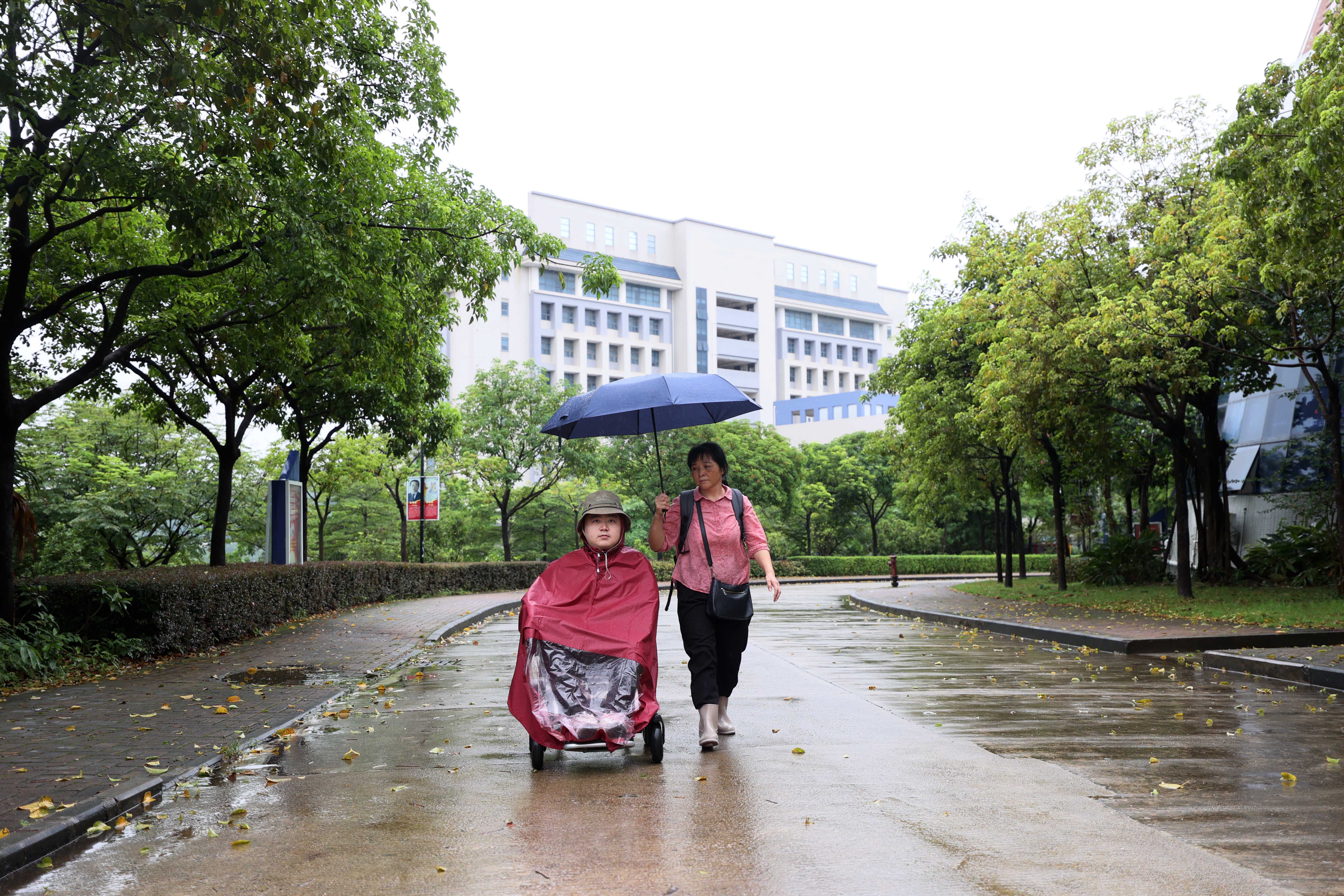 2024年9月6日,下班時下雨,李惠云為陳斌穿上雨衣,一起走回宿舍。