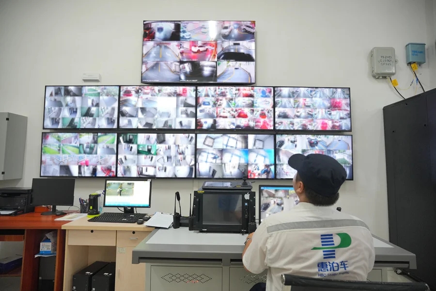 工作人員使用高清監(jiān)控對(duì)停車場(chǎng)車輛進(jìn)行引導(dǎo)管理。
