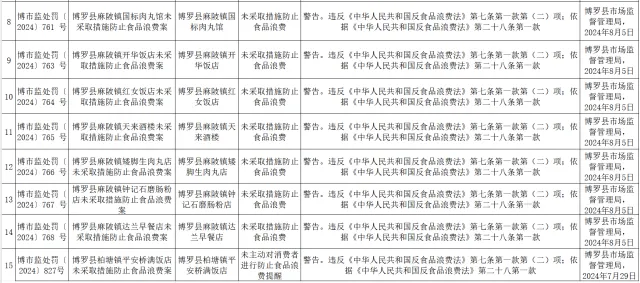 此外,博羅縣長(zhǎng)寧鎮(zhèn)友家早餐店、博羅縣麻陂鎮(zhèn)開(kāi)華飯店、博羅縣麻陂鎮(zhèn)國(guó)標(biāo)肉丸館、博羅縣麻陂鎮(zhèn)天來(lái)酒樓等9家餐飲店則均因未采取措施防止食品浪費(fèi)的行為被立案查處。以開(kāi)華飯店為例,執(zhí)法人員在檢查中發(fā)現(xiàn),企業(yè)未在經(jīng)營(yíng)場(chǎng)所醒目位置張貼或者擺放反食品浪費(fèi)標(biāo)識(shí),服務(wù)人員也未主動(dòng)對(duì)消費(fèi)者進(jìn)行防止食品浪費(fèi)提示提醒,引導(dǎo)消費(fèi)者按需適量點(diǎn)餐,從而被認(rèn)定為存在未采取措施防止食品浪費(fèi)的違法行為,均被給予警告處罰,責(zé)令企業(yè)進(jìn)行整改,倡導(dǎo)節(jié)約用餐,反對(duì)飲食浪費(fèi)。