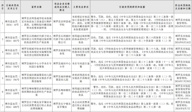 關(guān)注查處情況,5家被立案學(xué)校分別為:博羅縣京師薈成學(xué)校、博羅縣石灣鎮(zhèn)時(shí)代驕子幼兒園有限公司、博羅縣銀溪學(xué)校食堂、博羅縣福田中心小學(xué)和博羅縣福田鎮(zhèn);坌怯變簣@。