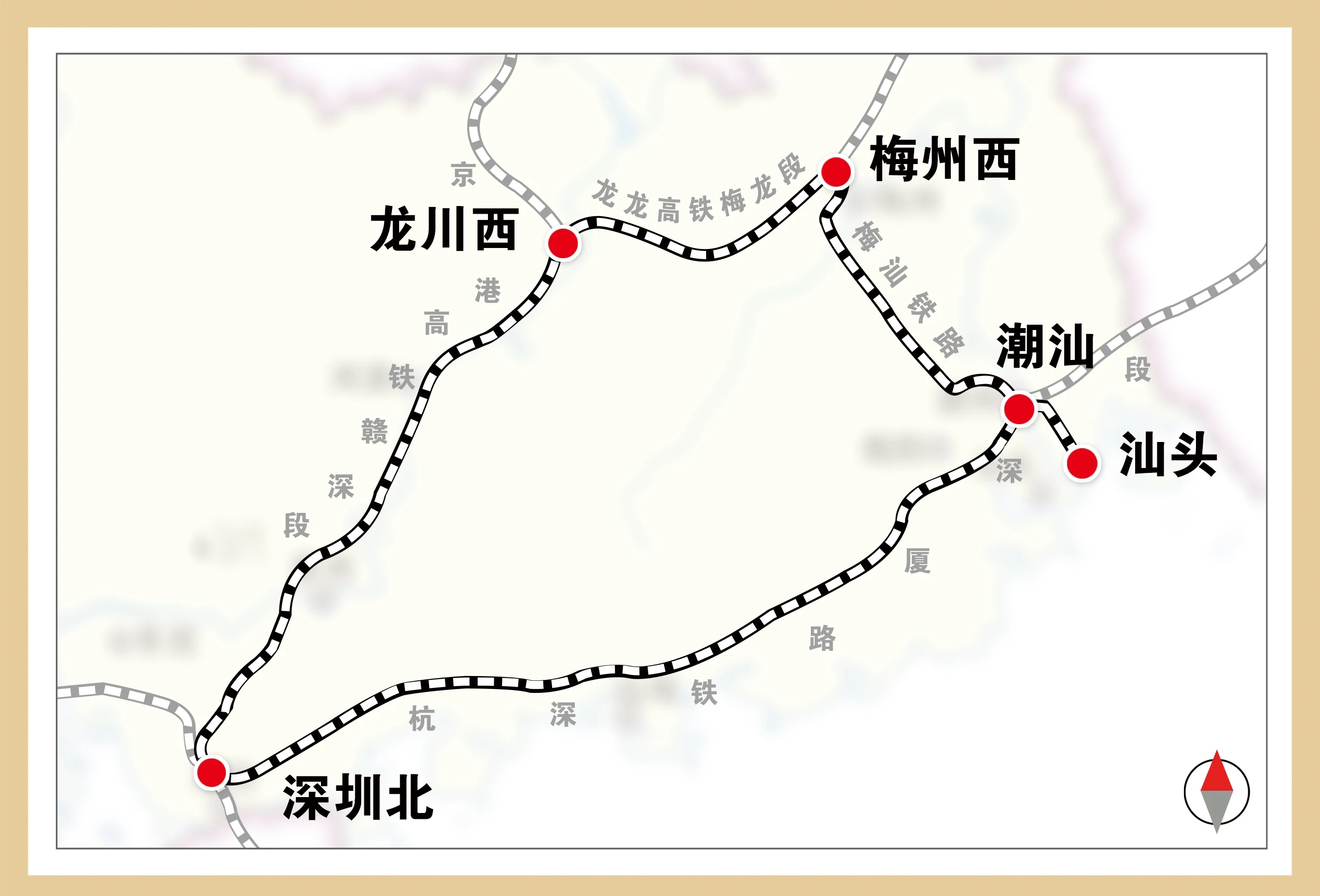 9月14日梅龍高鐵通車(chē)后,梅龍、梅汕線將分別與贛深高鐵、杭深線相連,4條高鐵形成粵東環(huán)線。初期,鐵路部門(mén)組織開(kāi)行2列以汕頭為起點(diǎn)和終點(diǎn)的粵東高鐵環(huán)線列車(chē),列車(chē)穿行汕頭、汕尾、深圳、東莞、惠州、河源、梅州、揭陽(yáng)、潮州9個(gè)城市,形成一張緊密交織、雙向流動(dòng)的高鐵網(wǎng)絡(luò)。