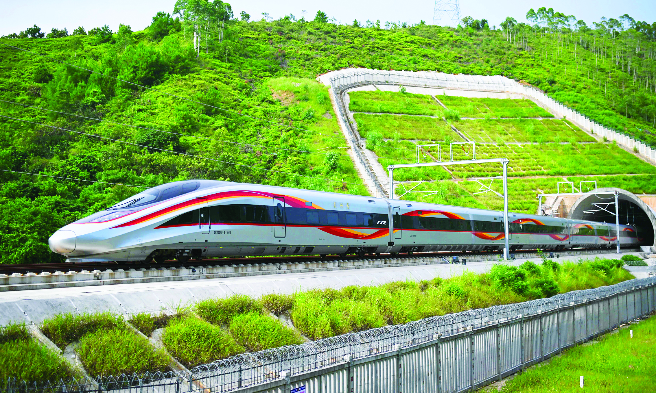9月14日上午11點30分,G8491次列車從梅州西站緩緩駛出,龍巖至龍川高鐵梅州西至龍川西段正式開通運營。自此,中國鐵路運營里程突破16萬公里,我國鐵路發(fā)展邁上新臺階。這是9月13日,復(fù)興號試驗列車駛出龍龍高鐵梅龍段毛公寨隧道。新華社發(fā)