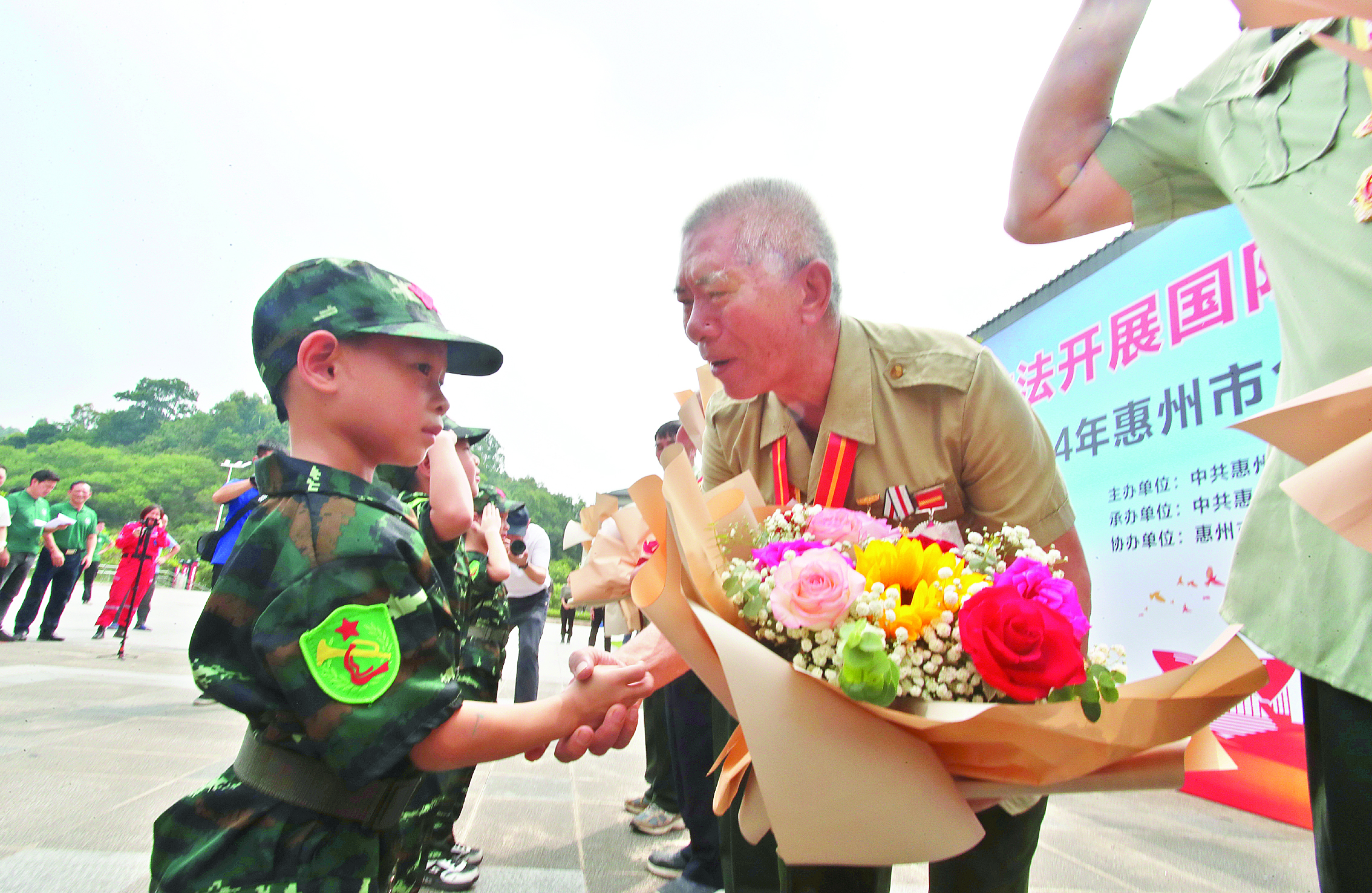 “國防教育小兵”向國家一等功臣代表獻(xiàn)花致敬。惠州日報(bào)記者鐘暢新 攝