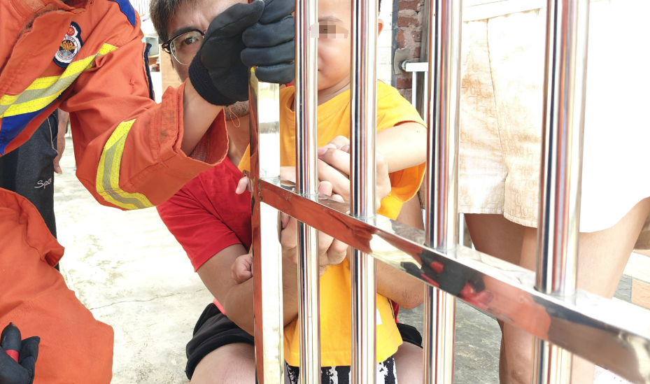 現場消防員發(fā)現,男童手指卡在金屬鎖孔內,被不銹鋼外殼完全包裹,外側無法觀察受傷情況,給救援帶來了一定難度。