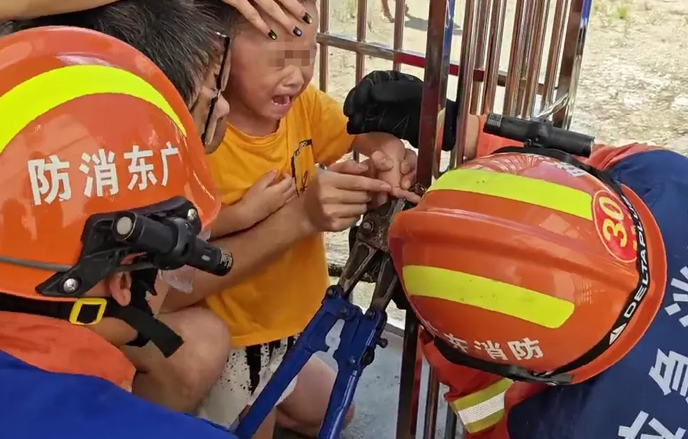 消防救援人員一邊安撫男童,一邊使用絕緣鉗將鎖孔外側剪斷,最終成功將男孩手指取出。