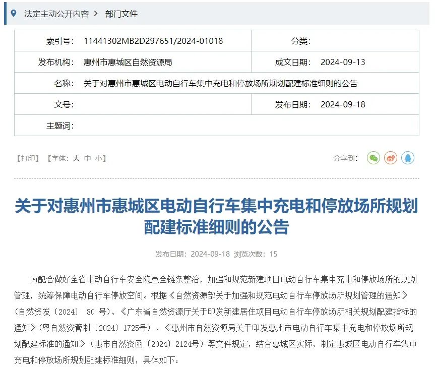 從公告可以知道,惠城區(qū)對新建建筑、商業(yè)、辦公、公園、綠化廣場、公共服務(wù)設(shè)施及工業(yè)建筑項(xiàng)目的電動(dòng)自行車的車位數(shù)量、停放區(qū)域、充電區(qū)域都有詳細(xì)要求。