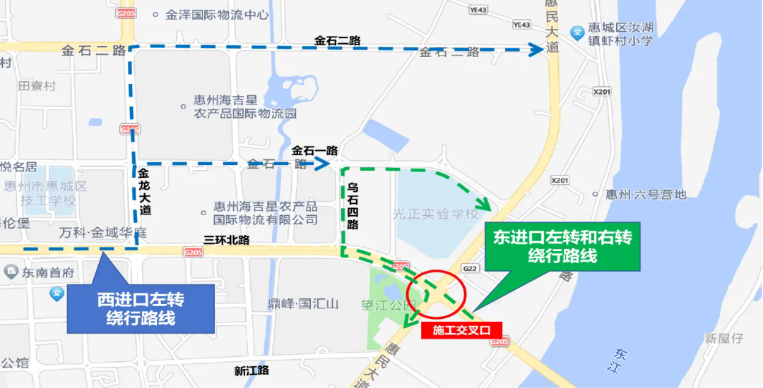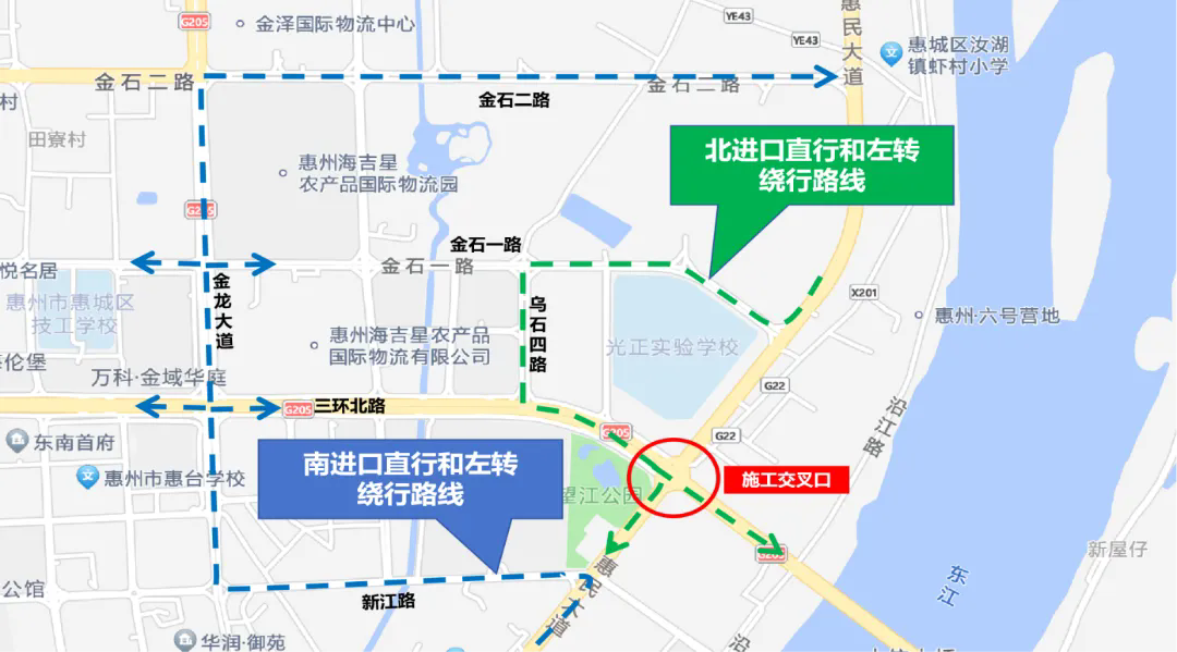 施工期間,原從北進(jìn)口直行和左轉(zhuǎn)車輛,可通過金石一路→烏石四路→三環(huán)北路等道路繞行;原從南進(jìn)口直行或左轉(zhuǎn)的車輛,可通過新江路→金龍大道等道路繞行。