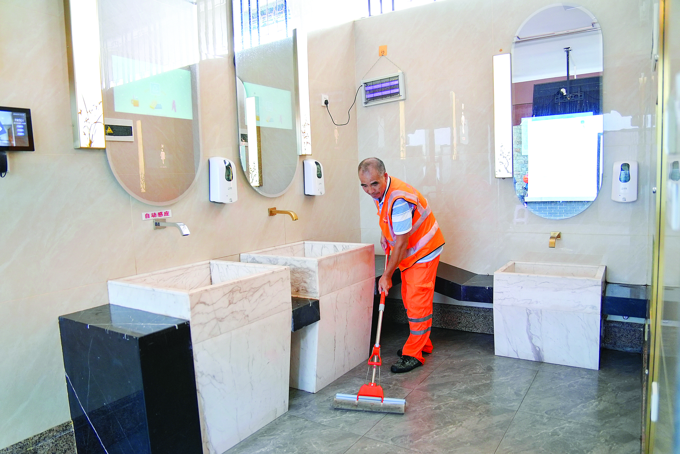 人流量較大的市區(qū)公廁均有專人保潔;葜萑?qǐng)?bào)記者羅劍業(yè) 攝