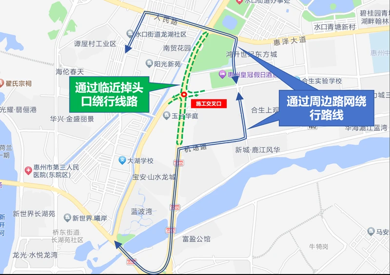 施工期間,原從三環(huán)東路左轉(zhuǎn)往皇冠路、三環(huán)東路左轉(zhuǎn)往水口大道、皇冠路左轉(zhuǎn)往三環(huán)東路、水口大道左轉(zhuǎn)往三環(huán)東路、皇冠路直行往返水口大道的車輛,請通過三環(huán)東路臨近掉頭口掉頭繞行或通過臨近的惠澤大道、機(jī)場路、惠州大道等道路繞行(如圖3所示);原從三環(huán)東路/皇冠路交叉口東西向通行的行人,請通過鄰近的三環(huán)東路/惠澤大道交叉口或三環(huán)東路/機(jī)場路交叉口的人行橫道通行。
