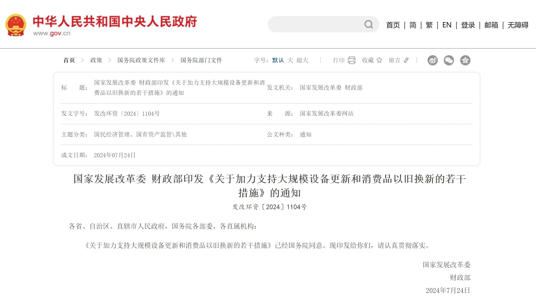 2024年7月24日,國家發(fā)展改革委、財政部印發(fā)了《關于加力支持大規(guī)模設備更新和消費品以舊換新的若干措施》的通知,提出要從今年發(fā)行的特別國債中,拿出3000億元用于支持設備更新、消費品以舊換新活動。