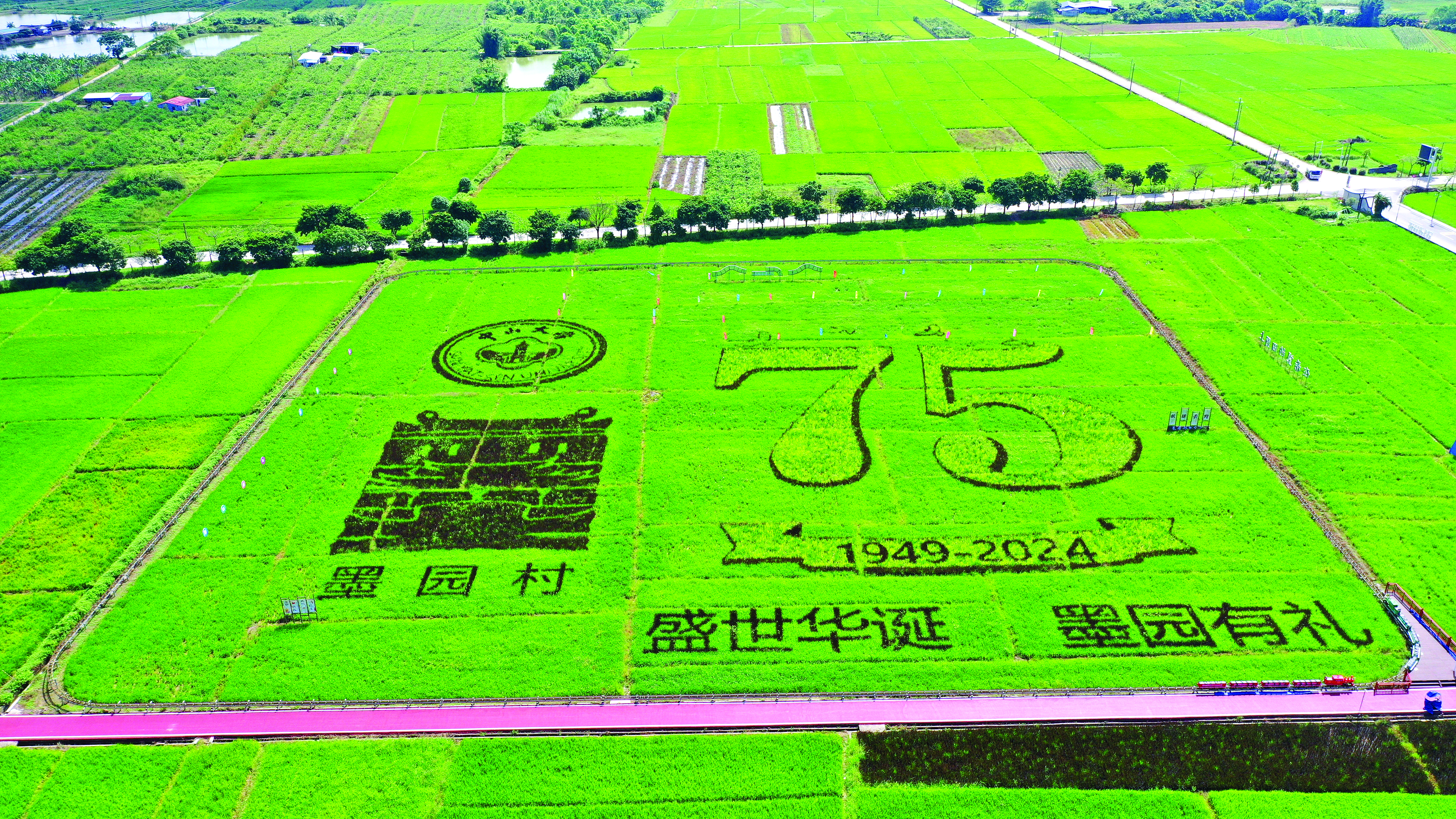 從高空俯瞰,一副巨型的由黑米與大米混合種植的“稻田畫”躍然田野上。約30畝的田園上,偌大的“75”造型寓意新中國成立以來的崢嶸歲月,旁邊由村里古建筑組合勾畫出的“墨園”文創(chuàng)村印赫然顯現(xiàn),“盛世華誕 墨園有禮”八個稻田字更是反映了墨園村民對國家興盛、鄉(xiāng)村振興的喜悅之情。