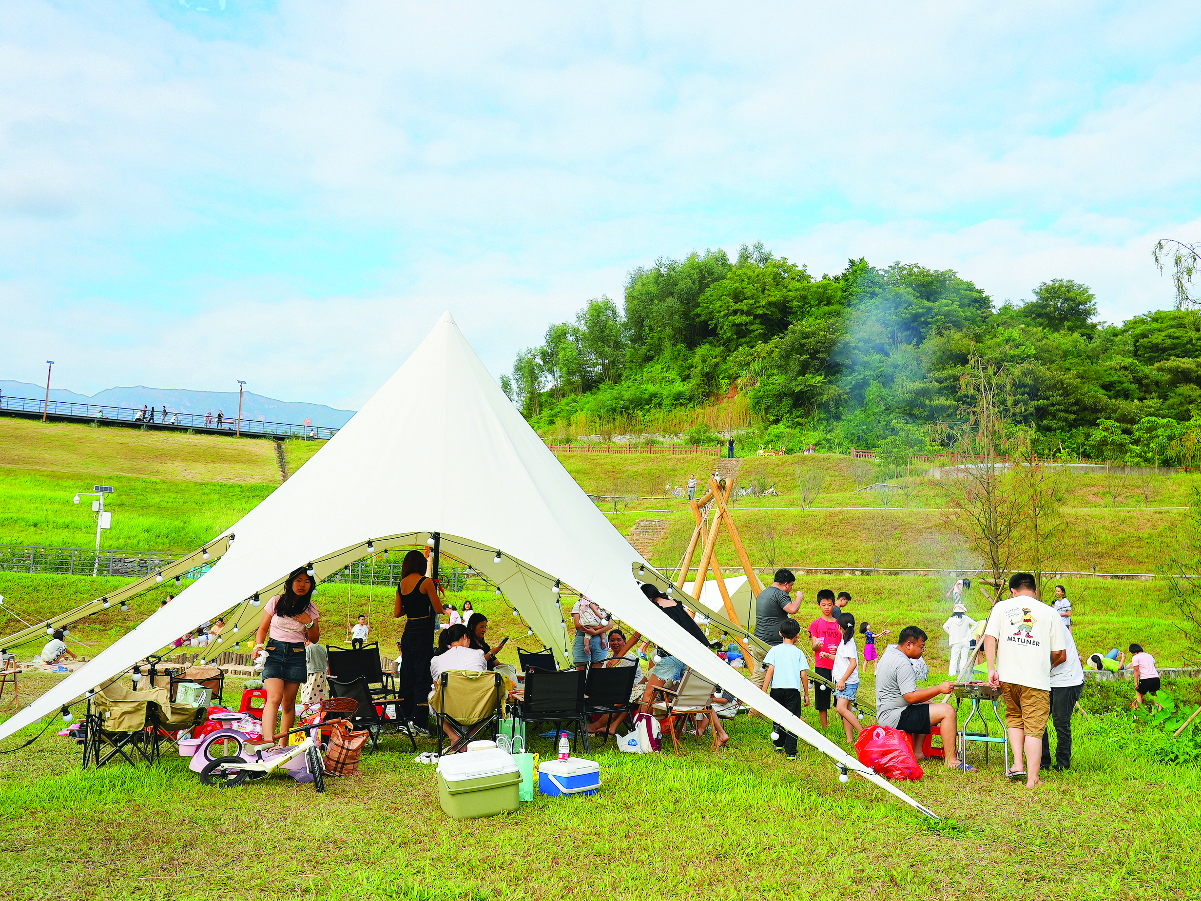 露營、燒烤、垂釣、騎行……這個(gè)國慶假期,位于長寧鎮(zhèn)羅村村的大洞·山境營地,也迎來了“開業(yè)即火爆”。該營地負(fù)責(zé)人謝錦恩介紹,營地在10月1日試業(yè),就迎來了眾多游客,“我們總共有30頂帳篷,這幾天每天都要翻臺面,平均每天的游客量有5000多人次!