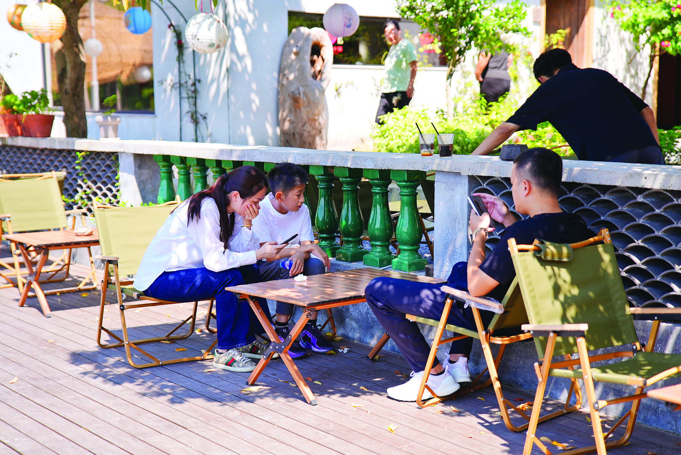 踏入庭院,流水潺潺的中式影壁,碎石路面上擺放著遮陽傘、木質(zhì)座椅、長石凳、石墩等,角落則搭起稻草亭,一眼望去簡樸而不失雅致。院內(nèi)布局錯(cuò)落有致,各式花卉和綠植環(huán)繞,陽光下,微風(fēng)里,一派悠閑的庭院生活。當(dāng)前,“穗月森晴”憑借其獨(dú)特的魅力在小紅書、抖音、視頻號等平臺走紅,“國慶假期我們的日均接待量高達(dá)500人次,很多客人來自珠三角地區(qū),我們也推出了非遺漆扇等活動,深受游客歡迎。”“穗月森晴”女主人黃燕平早年游歷全國,見識過很多不同風(fēng)情的庭院,今年返鄉(xiāng)創(chuàng)業(yè),率先在家鄉(xiāng)惠州落地她的夢想,通過“村咖+”打造更多新消費(fèi)場景,讓大家感受到鄉(xiāng)村的美好。