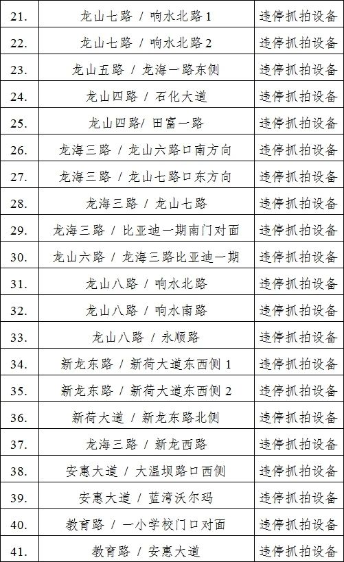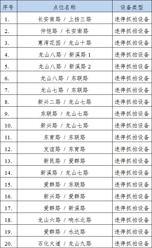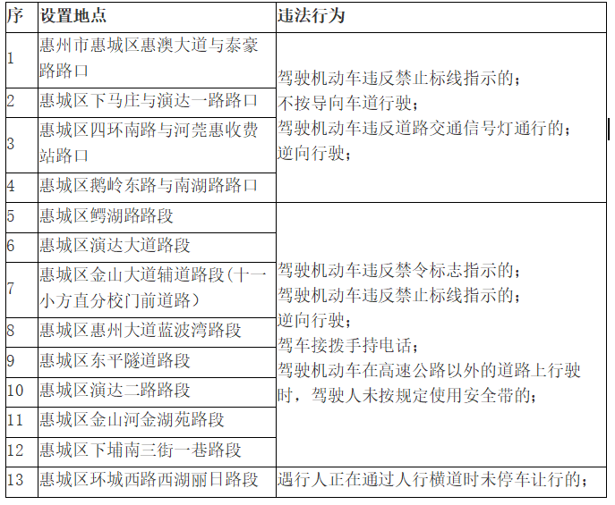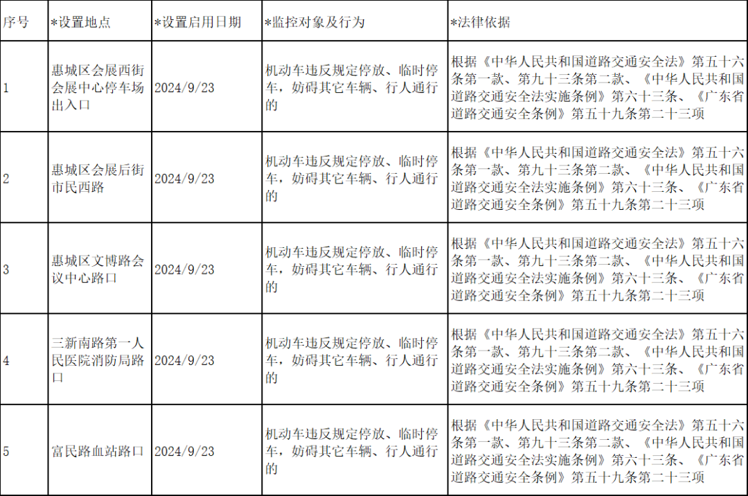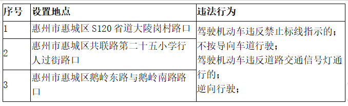 根據(jù)《中華人民共和國(guó)行政處罰法》第四十一條及《道路交通安全違法行為處理程序規(guī)定》第十六條關(guān)于“固定式交通技術(shù)監(jiān)控設(shè)備地點(diǎn)應(yīng)向社會(huì)公布”的規(guī)定,惠州市轄區(qū)范圍內(nèi)近期啟用的視頻監(jiān)控點(diǎn)位公布,具體如下: