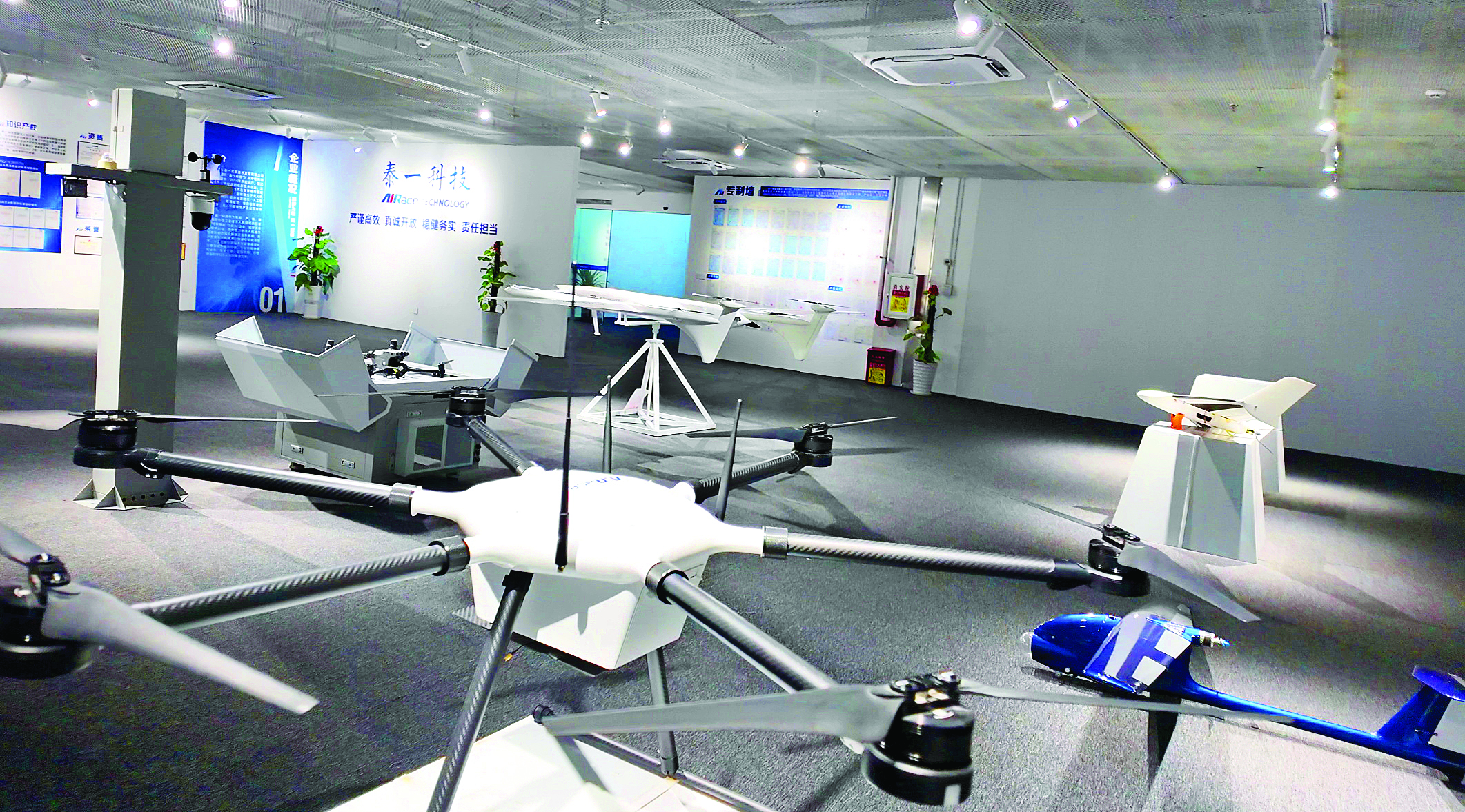 廣東泰一高新技術(shù)發(fā)展有限公司展廳內(nèi)的行業(yè)無(wú)人機(jī);葜萑?qǐng)?bào)記者黃鑫威 攝