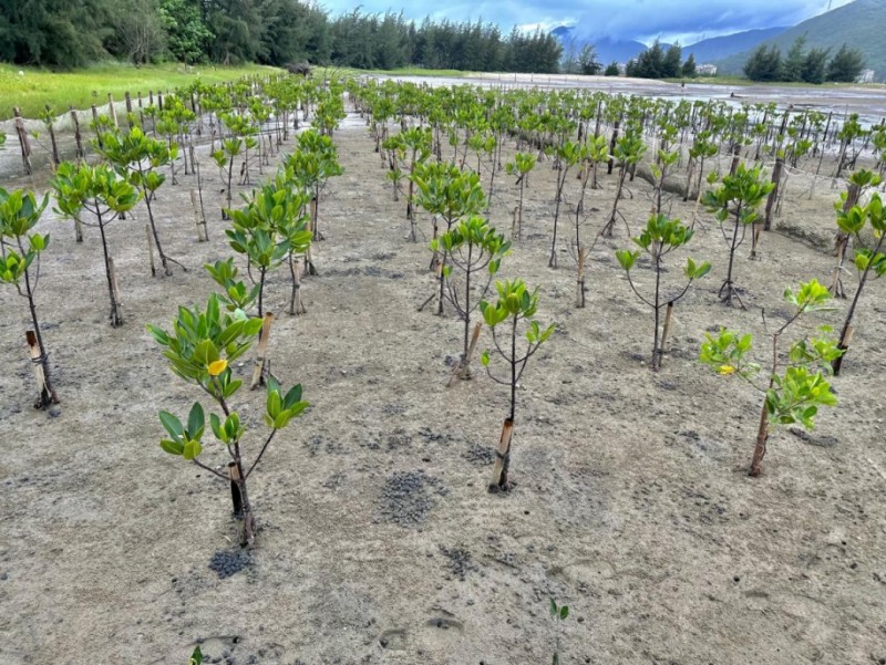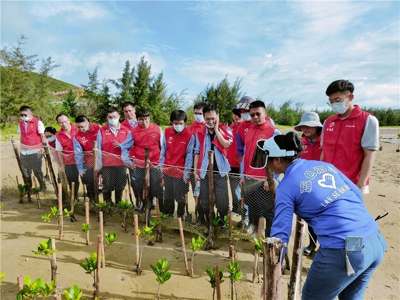 2021年4月22日,藍(lán)色海灣公益協(xié)會志愿者與惠州核電青年團(tuán)員,在煙墩嶺下近400平方米的灘涂濕地上,挖坑基、打樁、固定綁扎苗,共同種下了600多株秋茄(紅樹林的常見品種),并將此處命名為“惠核青年林”。