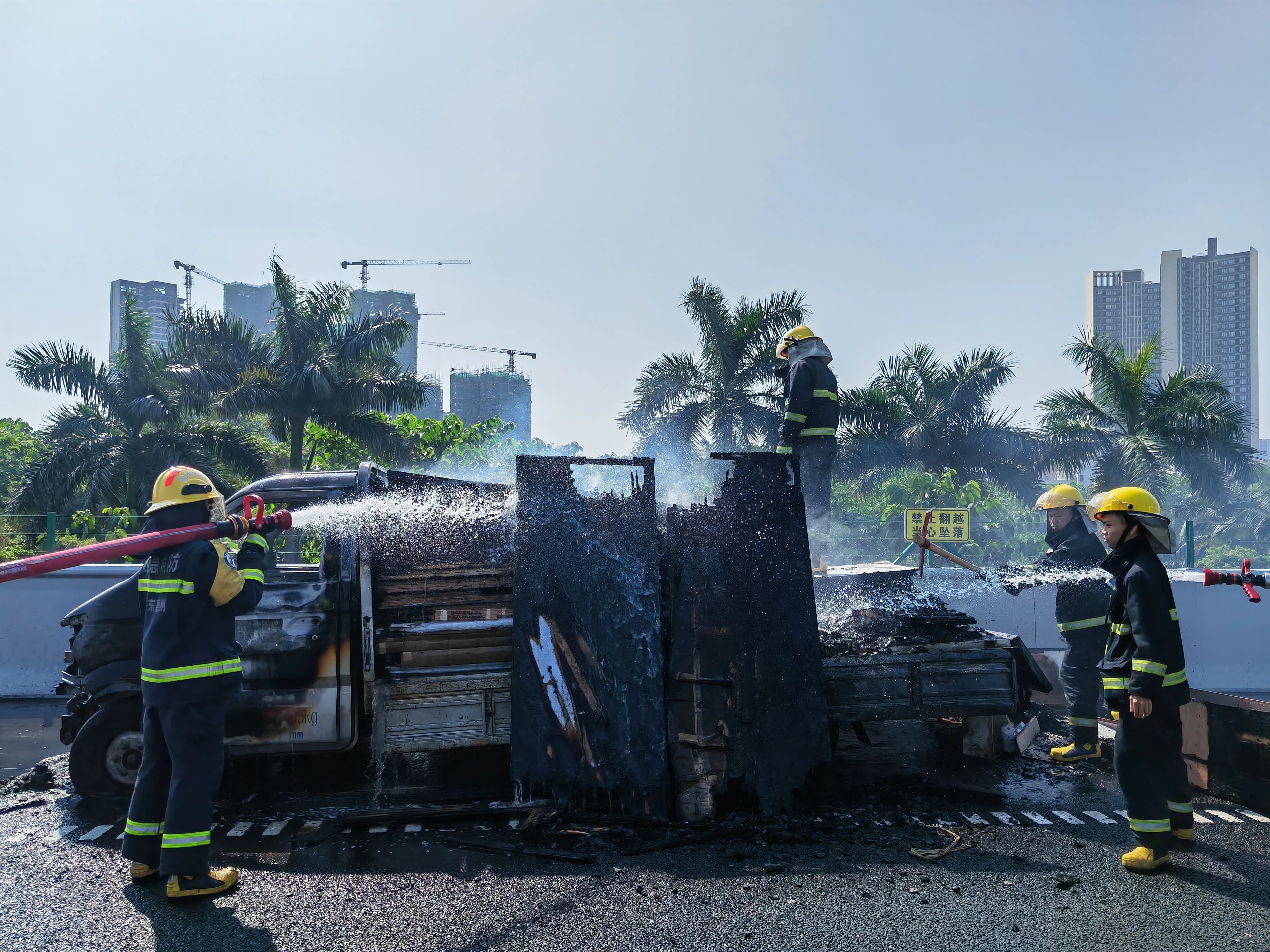到達(dá)現(xiàn)場(chǎng)后,消防員立即鋪設(shè)水槍對(duì)著火車輛進(jìn)行滅火降溫。明火全部撲滅后,消防利用丁字鎬將車上燃燒物品進(jìn)行翻查,查看是否存在隱患,并進(jìn)行隱火消除工作,防止再次引發(fā)火災(zāi)。