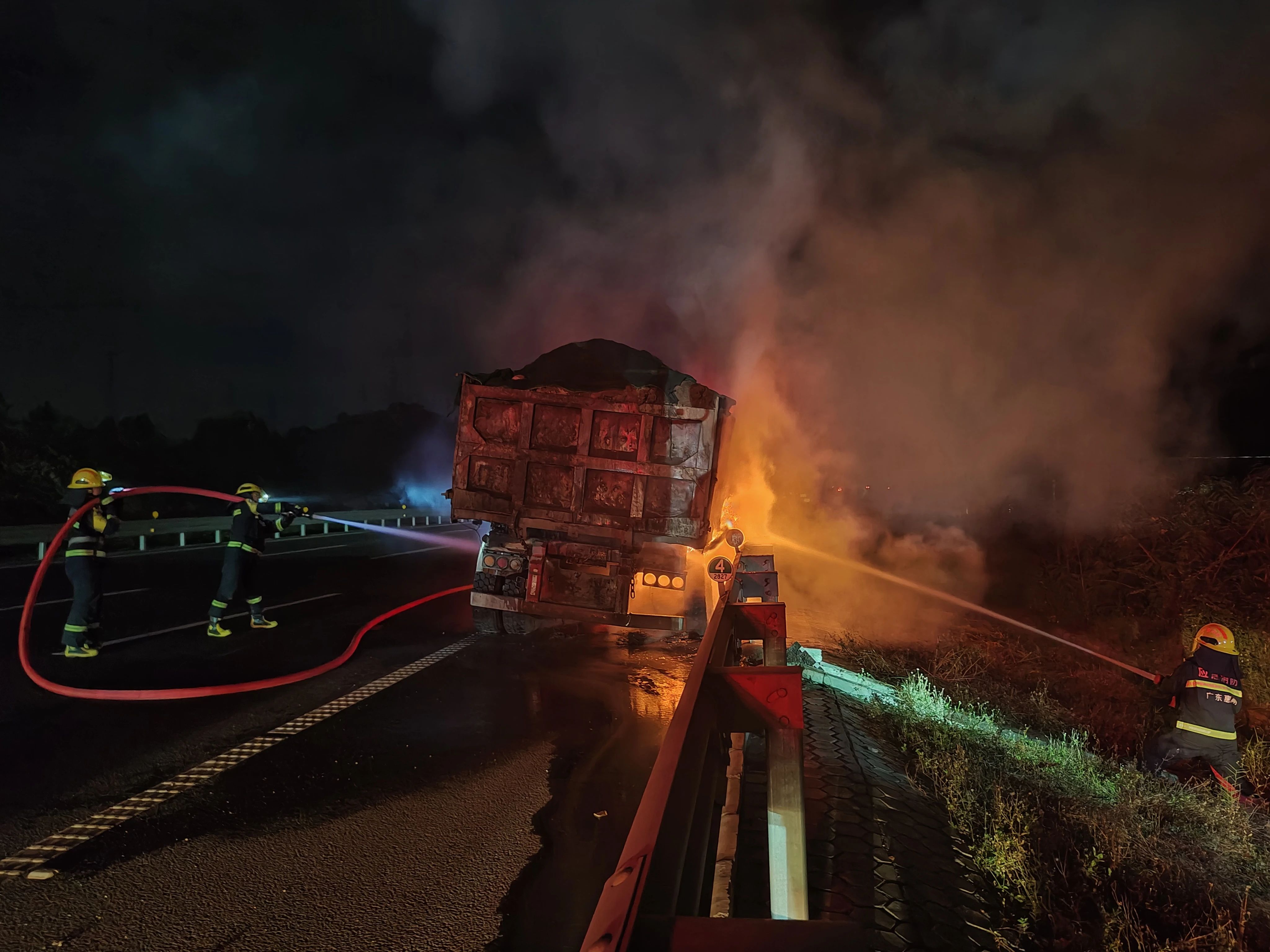 消防救援人員到達(dá)現(xiàn)場(chǎng)后經(jīng)勘查發(fā)現(xiàn),事故車輛上一輛裝載泥土的貨車,著火部位為貨車的右后輪胎。指揮員派出警示人員在車輛后方路段設(shè)置警戒區(qū),隨后出水槍對(duì)著火部位進(jìn)行滅火降溫,很快明火被撲滅。