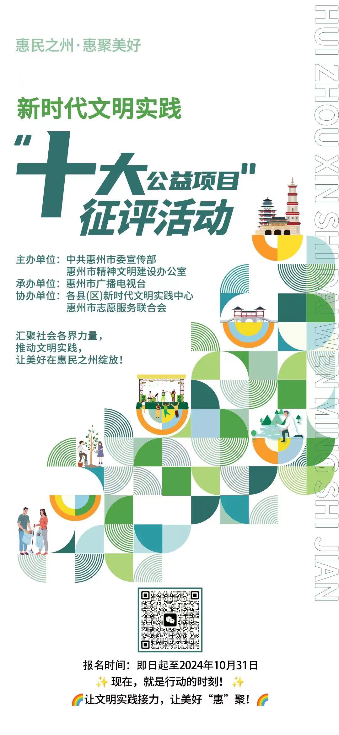 為進一步實施“惠民之州·惠聚美好”傳播工程,推動惠州市新時代文明實踐工作提檔升級,激發(fā)社會各界參與文明實踐的熱情與創(chuàng)造力,圍繞文明實踐賦能“百千萬工程”,精準對接群眾需求,中共惠州市委宣傳部、惠州市精神文明建設(shè)辦公室開展惠民之州·惠聚美好——新時代文明實踐“十大公益項目”征評活動。