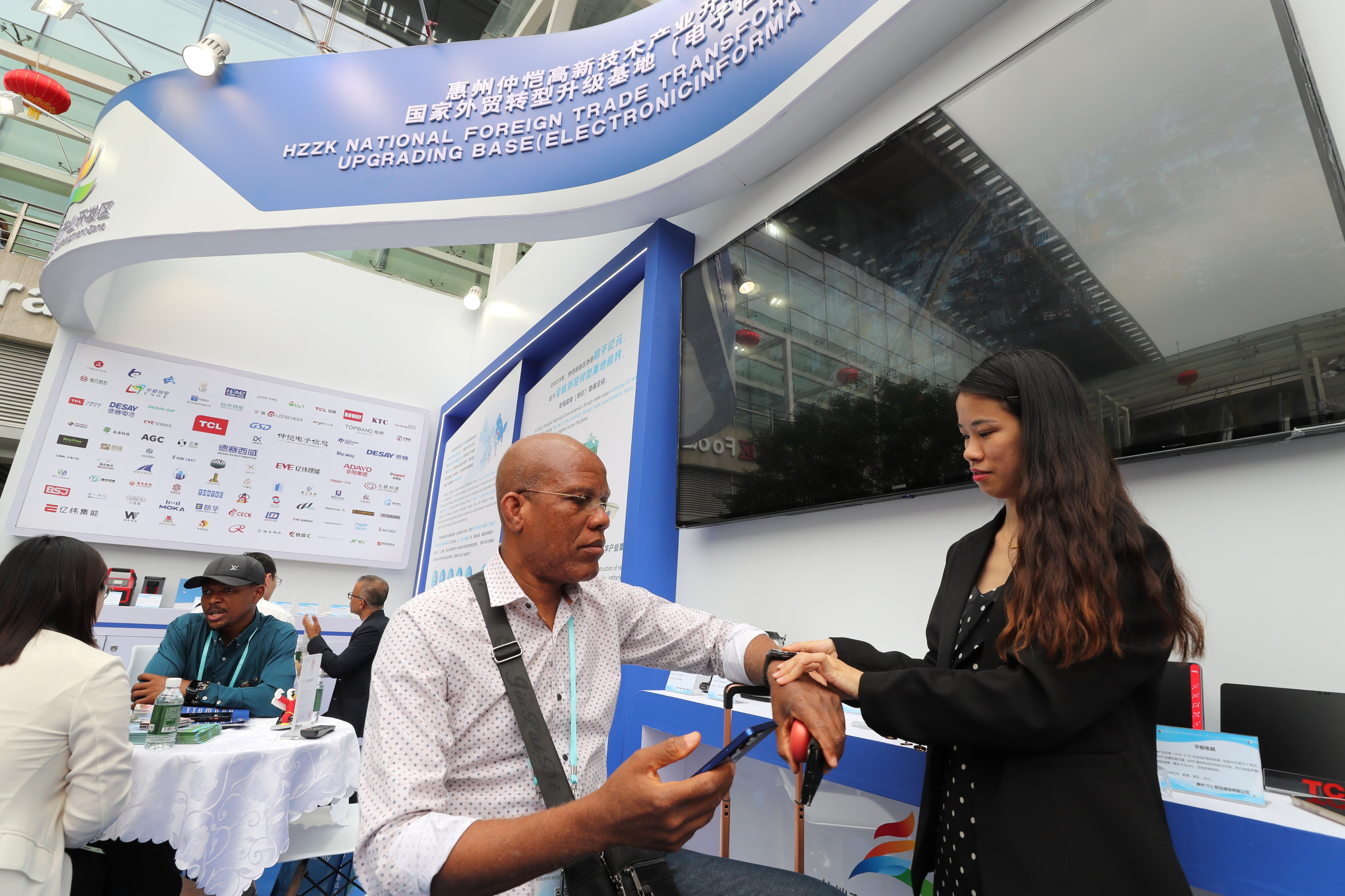 客商在仲愷國(guó)家外貿(mào)轉(zhuǎn)型升級(jí)基地集中展示區(qū)體驗(yàn)電子手表。