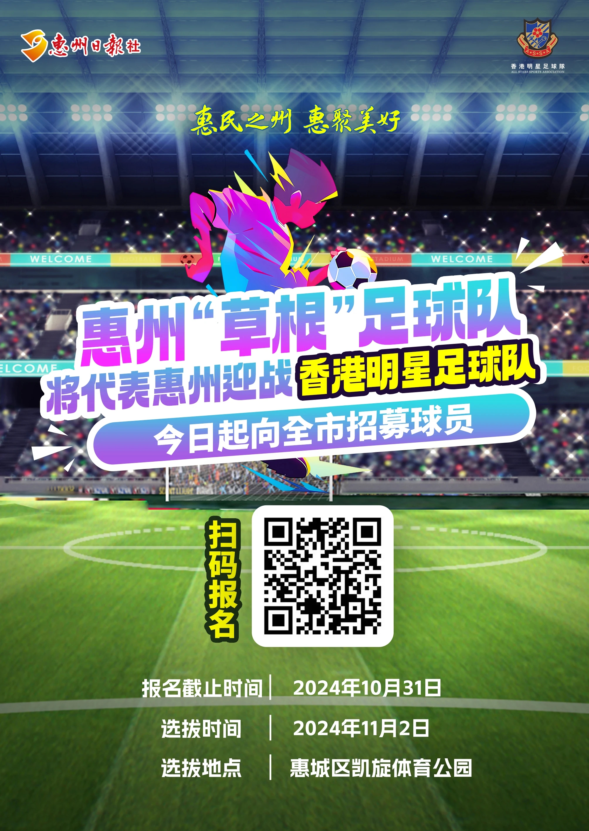 目前,惠州“草根”足球隊隊員持續(xù)招募中。不限年齡、職業(yè)、性別,只要你是熱愛足球、擁有一定的足球技能和潛力的非職業(yè)足球運動員,都可以報名參加本次比賽。賽事報名截止時間為10月31日,感興趣的可關(guān)注“惠州日報”微信公眾號或掃描二維碼報名,香港明星足球隊惠州公益邀請賽等你來戰(zhàn)。