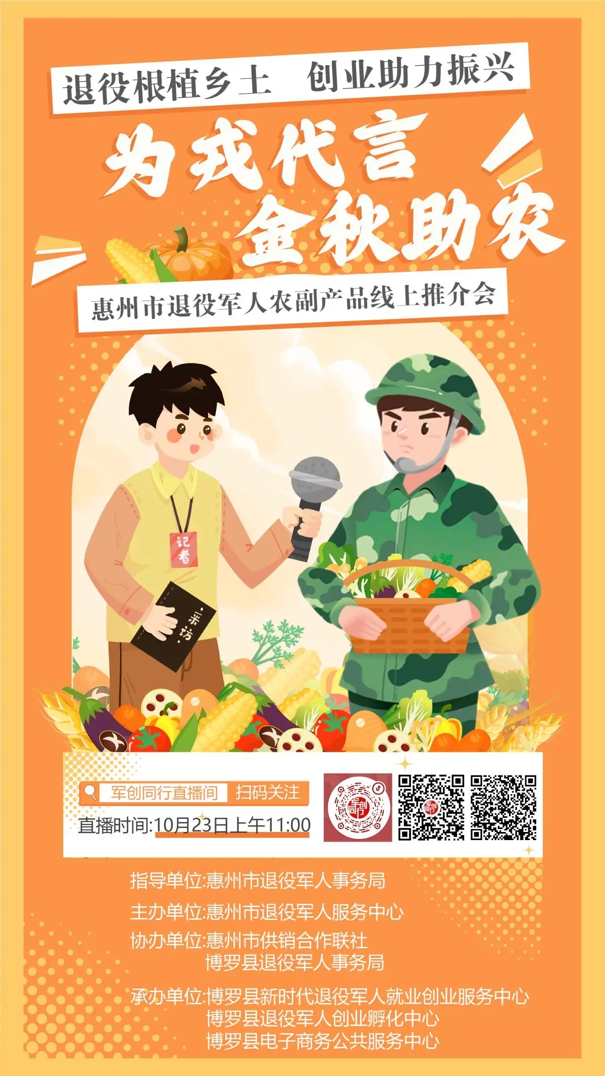 展銷優(yōu)質(zhì)軍創(chuàng)農(nóng)副產(chǎn)品、邀請(qǐng)退役軍人創(chuàng)業(yè)先鋒、暢談創(chuàng)業(yè)背后感人故事。10月23日上午11:00,由市退役軍人服務(wù)中心主辦的“為戎代言·金秋助農(nóng)”惠州市退役軍人農(nóng)副產(chǎn)品直播推介會(huì)將開播,屆時(shí)誠(chéng)邀您來(lái)直播間做客。
