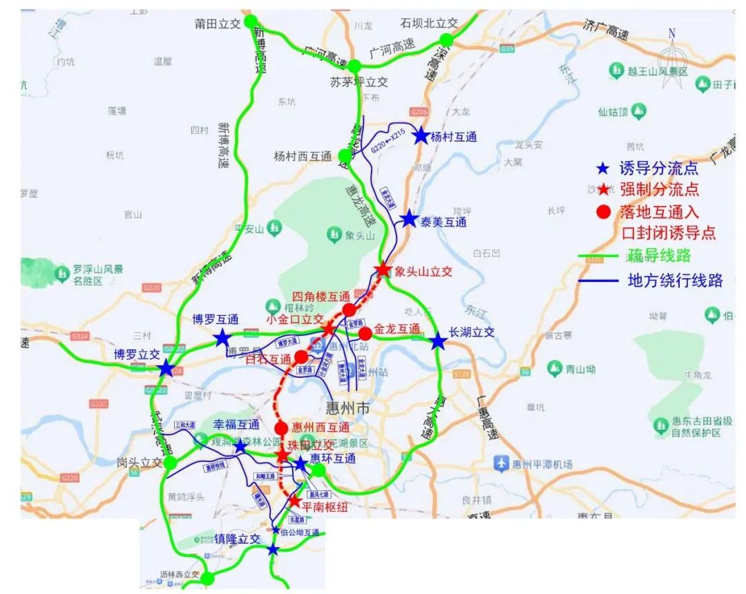 4.長(zhǎng)深高速惠州北往深圳、河源方向車(chē)輛可通過(guò)小金河大道繞行廣惠高速金龍互通通行;