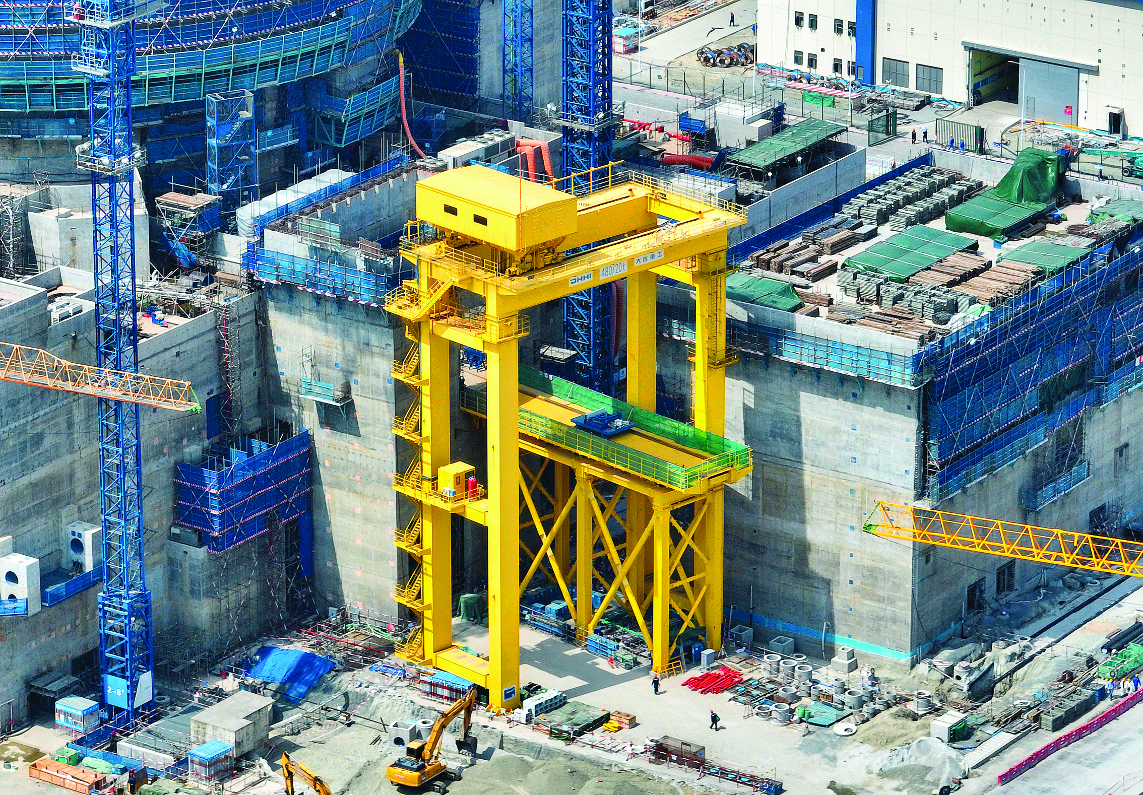 走到二號(hào)機(jī)組廠(chǎng)房外圍時(shí),記者一眼便明白了:確實(shí)是個(gè)“顯眼包”。在項(xiàng)目一片淺灰色墻體中,亮黃色的它確實(shí)顯眼極了。它很高,近20米,約相當(dāng)于7層樓高;它很寬大,寬近8米,長(zhǎng)約28米,重約253噸,相當(dāng)于約84輛小轎車(chē)的重量。