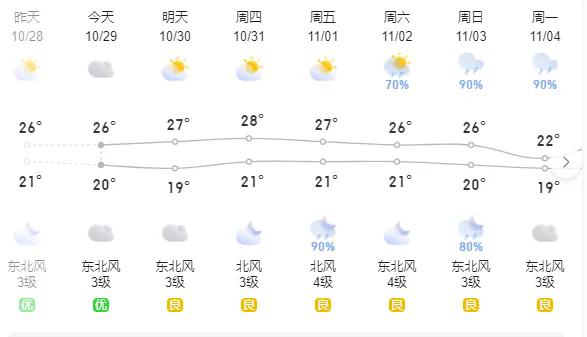 預(yù)計,今天白天我市各地多云間陰天,最高氣溫27℃左右;30日,多云到晴天,最低氣溫19~21℃,最高氣溫28℃左右;31日-11月2日,晴朗干燥,最低氣溫17~20℃,最高氣溫28~30℃;3-4日,多云為主。
