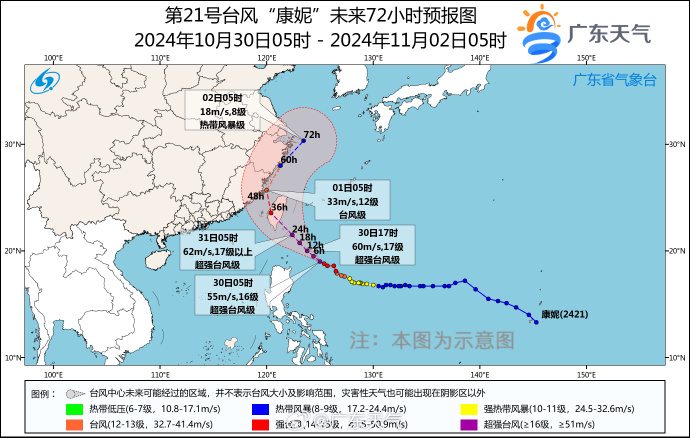 據(jù)廣東天氣29日11時的消息,今年第21號臺風“康妮”(臺風級)強度逐漸增強,最強可達強臺風級或超強臺風級(48-55米/秒,15~16級),并將于31日中午到傍晚在臺灣島南部沿海登陸,隨后穿過臺灣島進入臺灣海峽,登陸或擦過福建沿海地區(qū),隨后轉(zhuǎn)向偏東北方向。