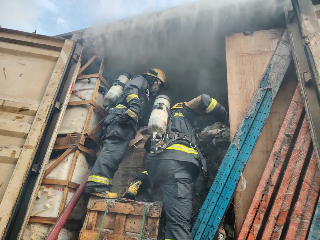 消防員利用穿刺水槍深入貨物堆垛內(nèi)部進(jìn)行冷卻