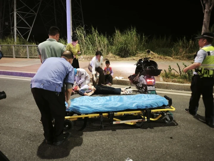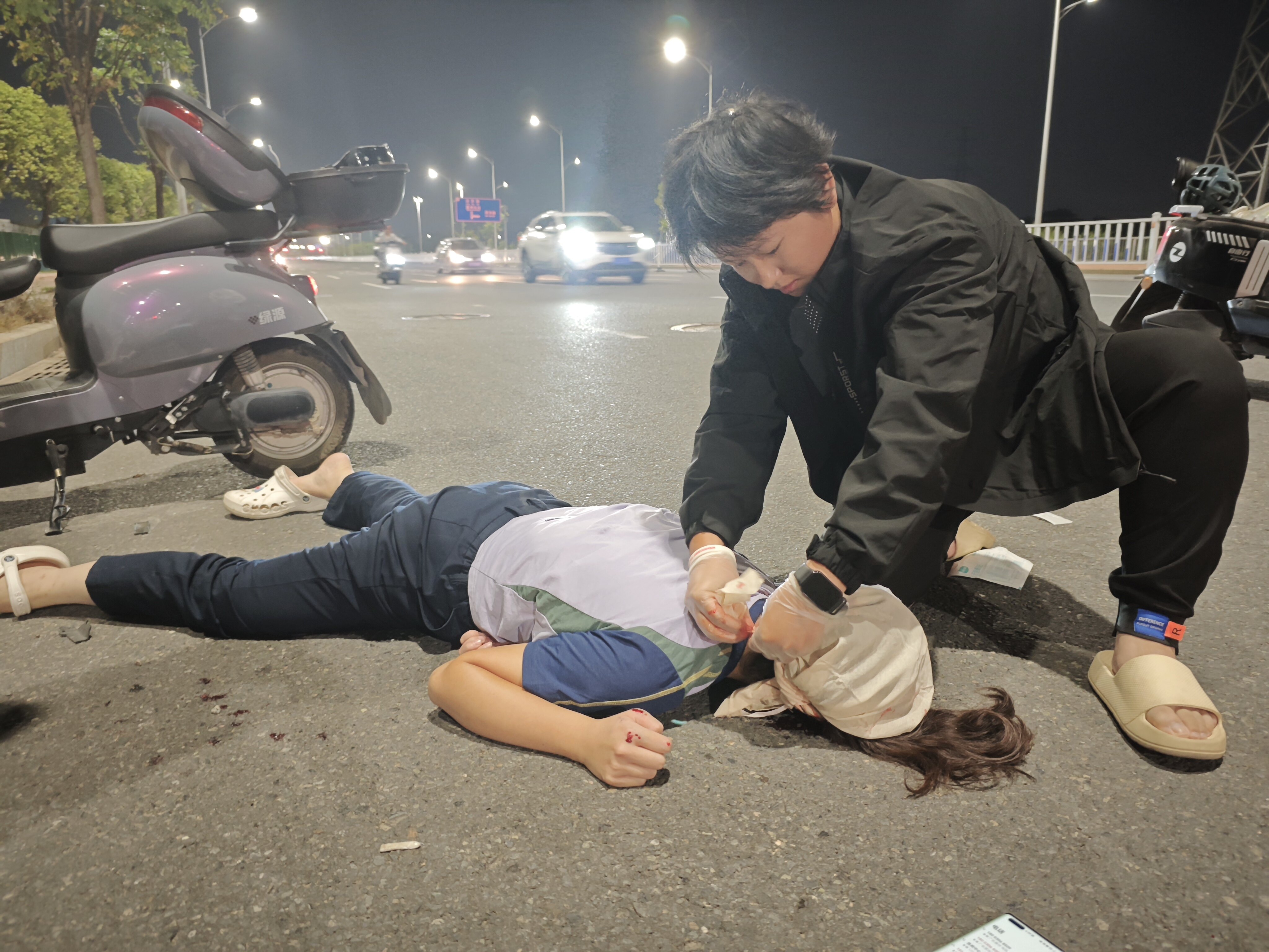 10月30日下午6時30分許,夜幕降臨,贛深高鐵惠州北站出口白石路段,一女子駕駛電動車載著一名小男孩,發(fā)生車禍,兩人摔倒在地,其中女子頭部受傷流血。所幸的是,路過此地的惠州市惠城區(qū)蛟龍應(yīng)急救援中心志愿者張丹丹及時出手,對他們進(jìn)行急救,并送至救護(hù)車。