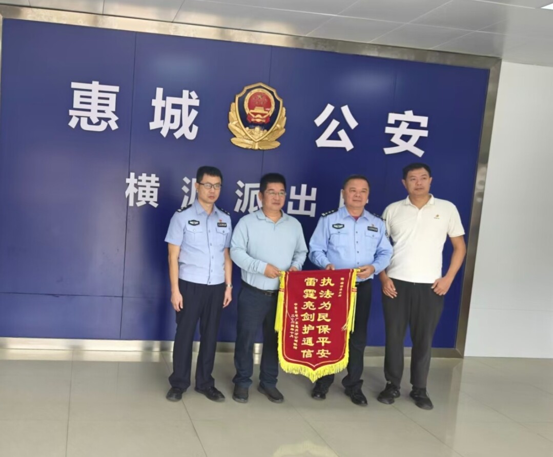 10月29日,惠州移動代表攜一面印有“執(zhí)法為民保平安,雷霆亮劍護(hù)通信”字樣的錦旗送至前往橫瀝派出所,感謝公安機關(guān)在案件偵破過程中的辛勤付出。