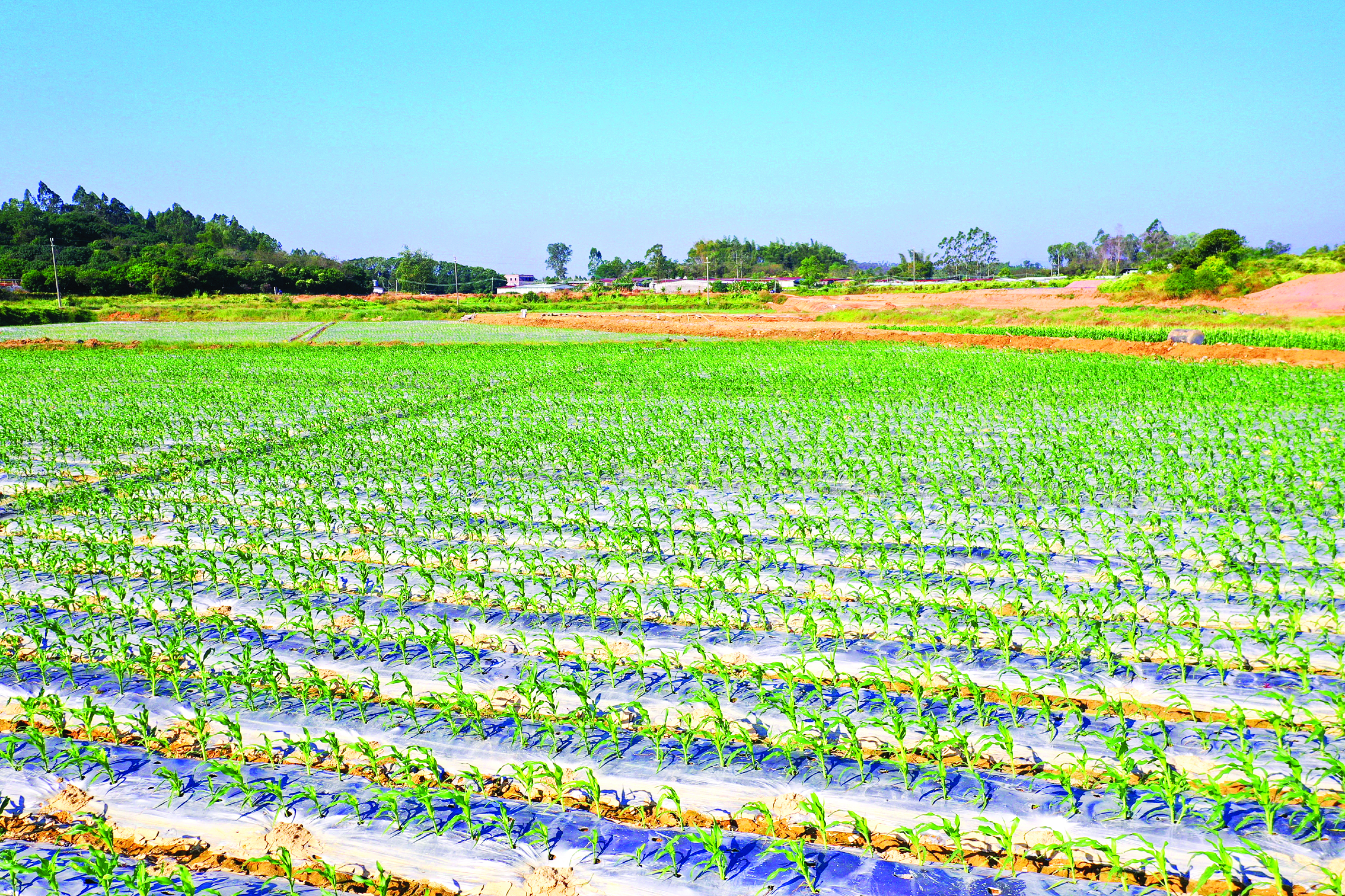 在汝湖鎮(zhèn)黃埔村連片的玉米地里,甜玉米苗在暖陽下茁壯生長。 惠州日報記者哈鵬 攝