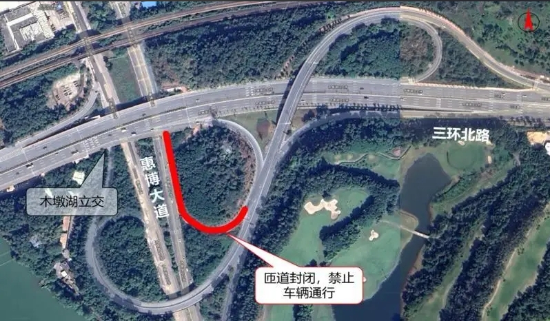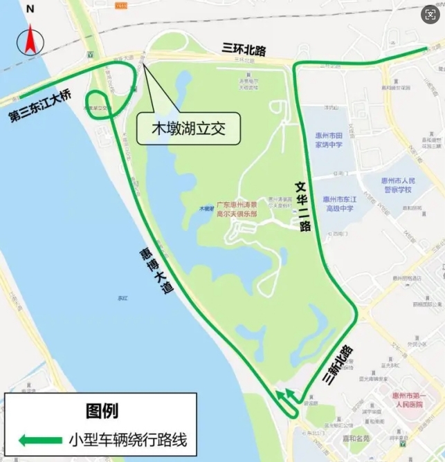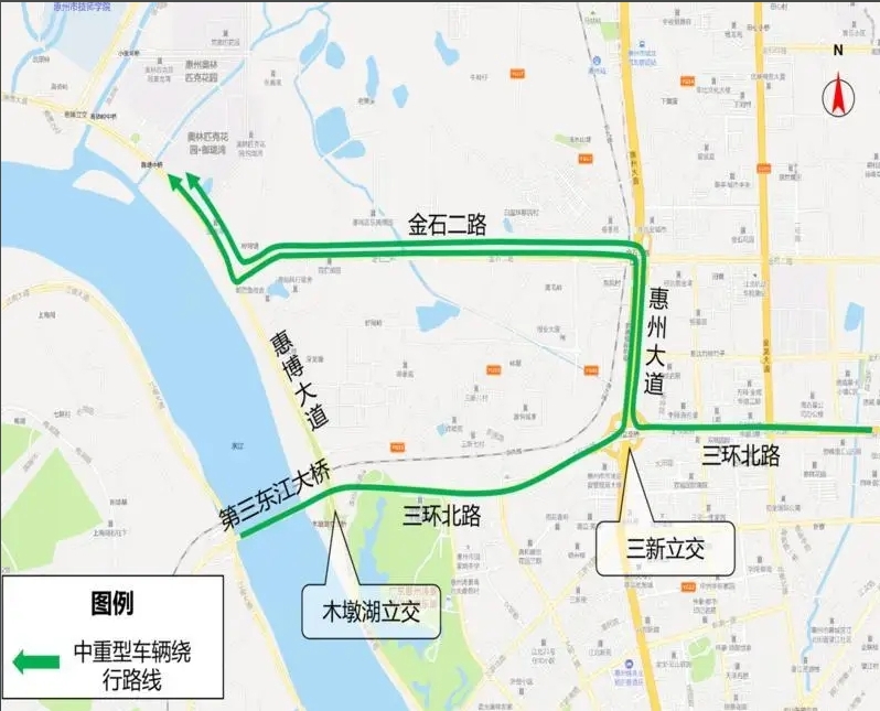 其他原從第三東江大橋往惠博大道(往博羅方向)的車輛(中重型貨車除外),可通過(guò)木墩湖立交向南繞行至三新北路交叉口,掉頭后駛?cè)牖莶┐蟮;原從三環(huán)北路轉(zhuǎn)惠博大道(往博羅方向)的車輛(中重型貨車除外),可提前在三環(huán)北路/文華二路交叉口左轉(zhuǎn),通過(guò)文華二路-三新北路-惠博大道繞行。
