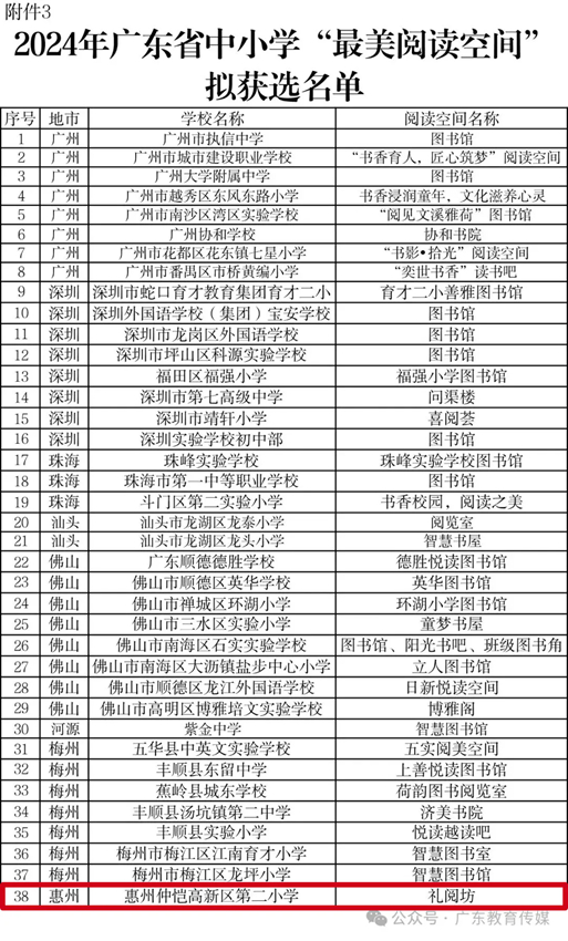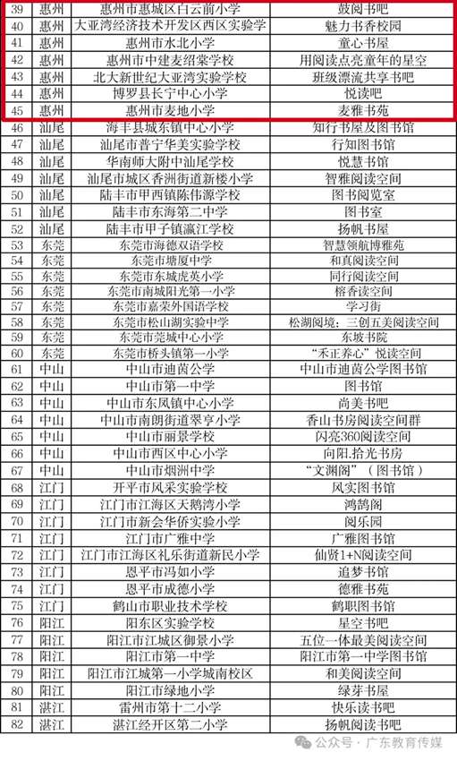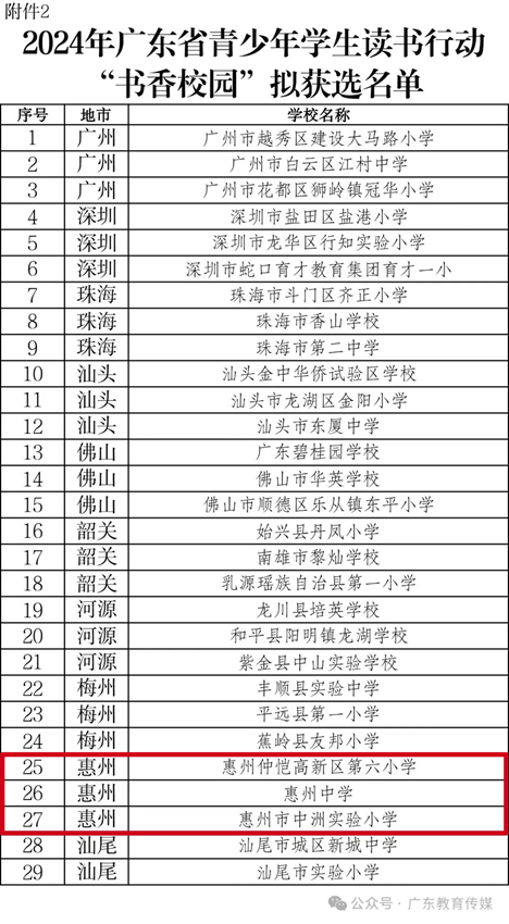 根據(jù)教育部辦公廳《關(guān)于開展2024年全國青少年學(xué)生讀書行動區(qū)域優(yōu)秀案例征集活動的通知》(教基廳函〔2024〕30號)和《廣東省教育廳關(guān)于開展2024年廣東省中小學(xué)“書香校園”建設(shè)系列活動的通知》精神,經(jīng)組織專家嚴(yán)格評審,擇優(yōu)遴選出2024年廣東省青少年學(xué)生讀書行動區(qū)域優(yōu)秀案例5個擬推薦教育部;“書香校園”61所(其中,惠州有3所);2024年廣東省中小學(xué)“最美閱讀空間”120個(其中,惠州有8個),F(xiàn)將名單予以公示,公示期為2024年11月20日至2024年11月27日。