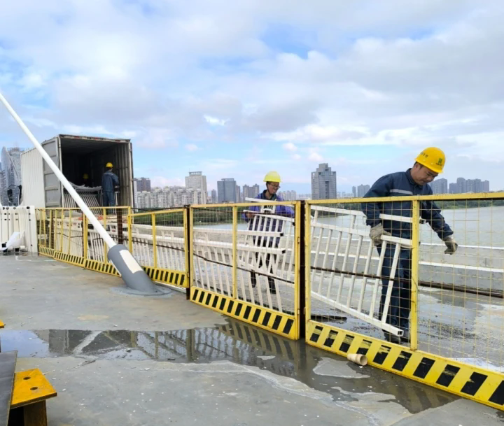 施工人員正在為鵝城大橋上的非機(jī)動(dòng)車道和人行道安裝護(hù)欄。