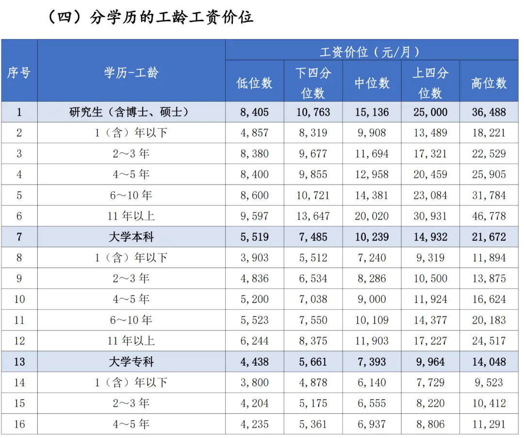 工作經(jīng)驗(yàn)的積累與薪酬增長密切相關(guān)。研究生普遍中位數(shù)薪資在15136元/月,初中學(xué)歷則普遍中位數(shù)薪資在5441元/月。