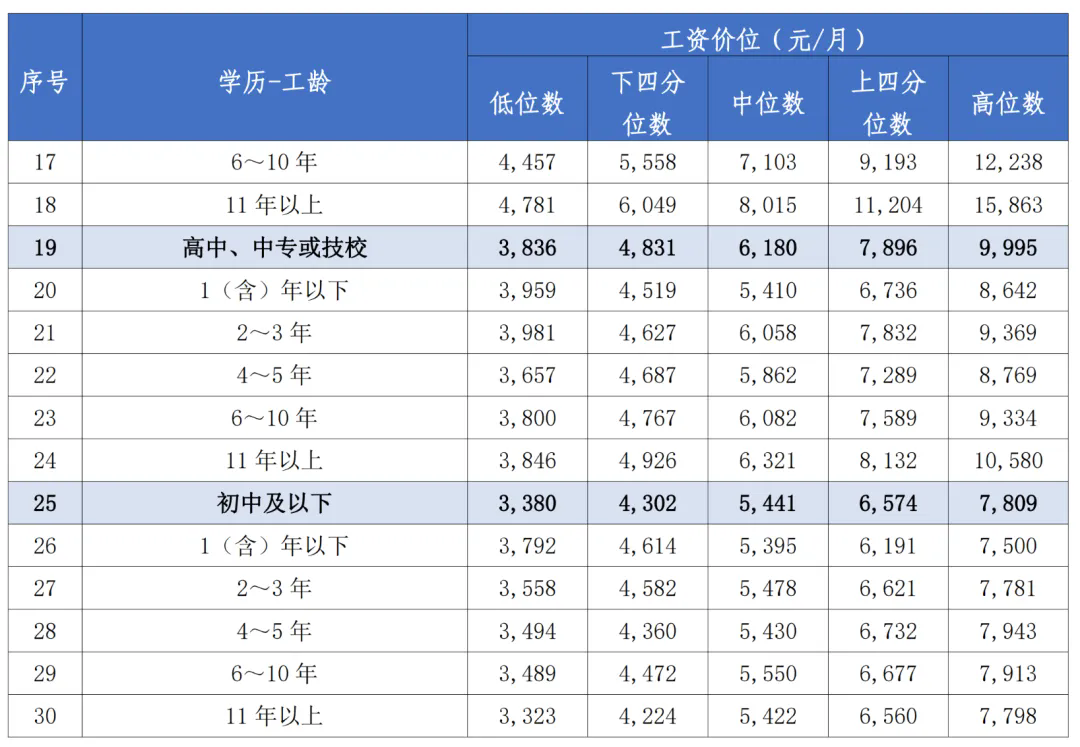 值得注意的是,學(xué)歷越高,工齡越久,薪資上浮空間越大,以研究生和初中學(xué)歷為例:研究生工齡1年及以下中位數(shù)工資價(jià)位9908元/月,工齡11年以上20020元/月,相差10112元/月;而初中學(xué)歷工齡1年及以下中位數(shù)工資價(jià)位5395元/月,工齡11年以上5422元/月,僅相差27元/月。