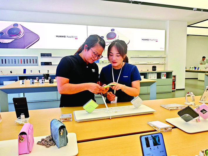 顧客在門店體驗折疊屏手機(jī)。惠州日報記者游璇鈺 陳春惠 攝