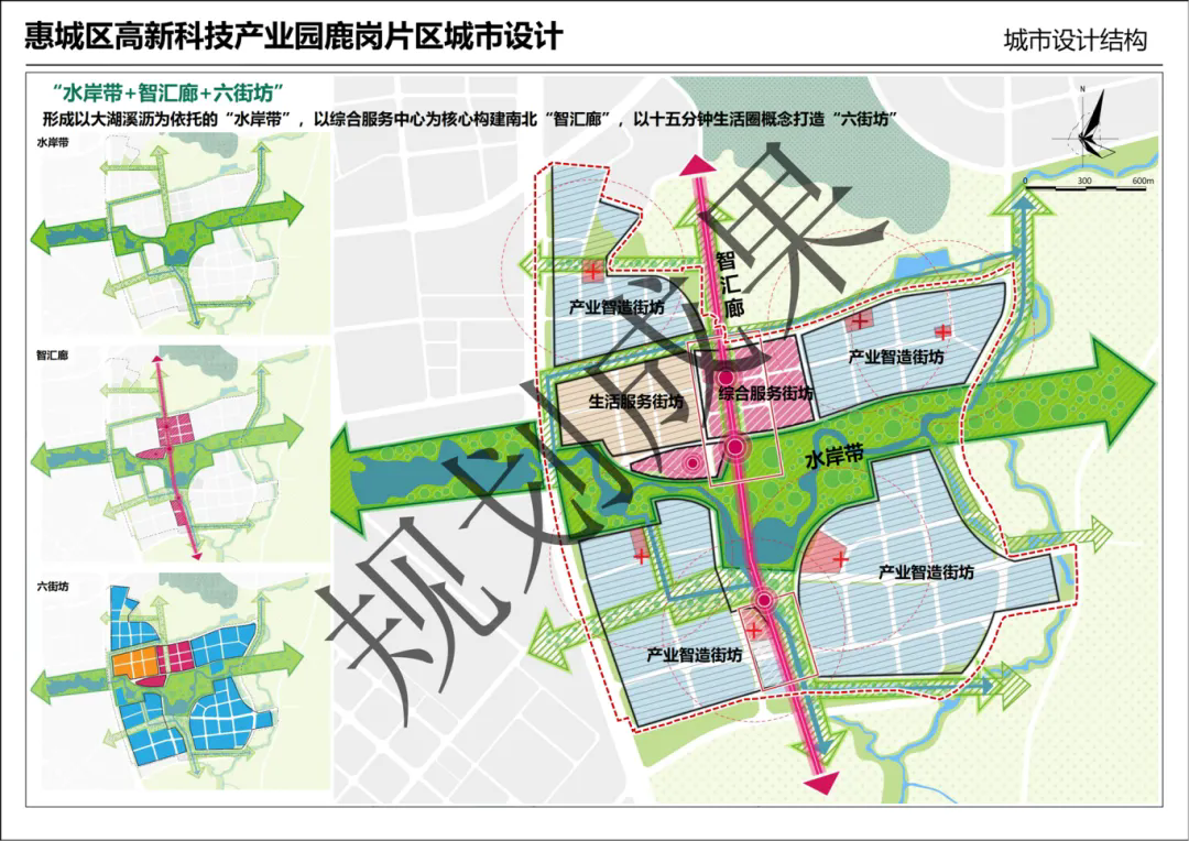鹿崗片區(qū)的城市設(shè)計(jì)結(jié)構(gòu)為“水岸帶+智匯廊+六街坊”。