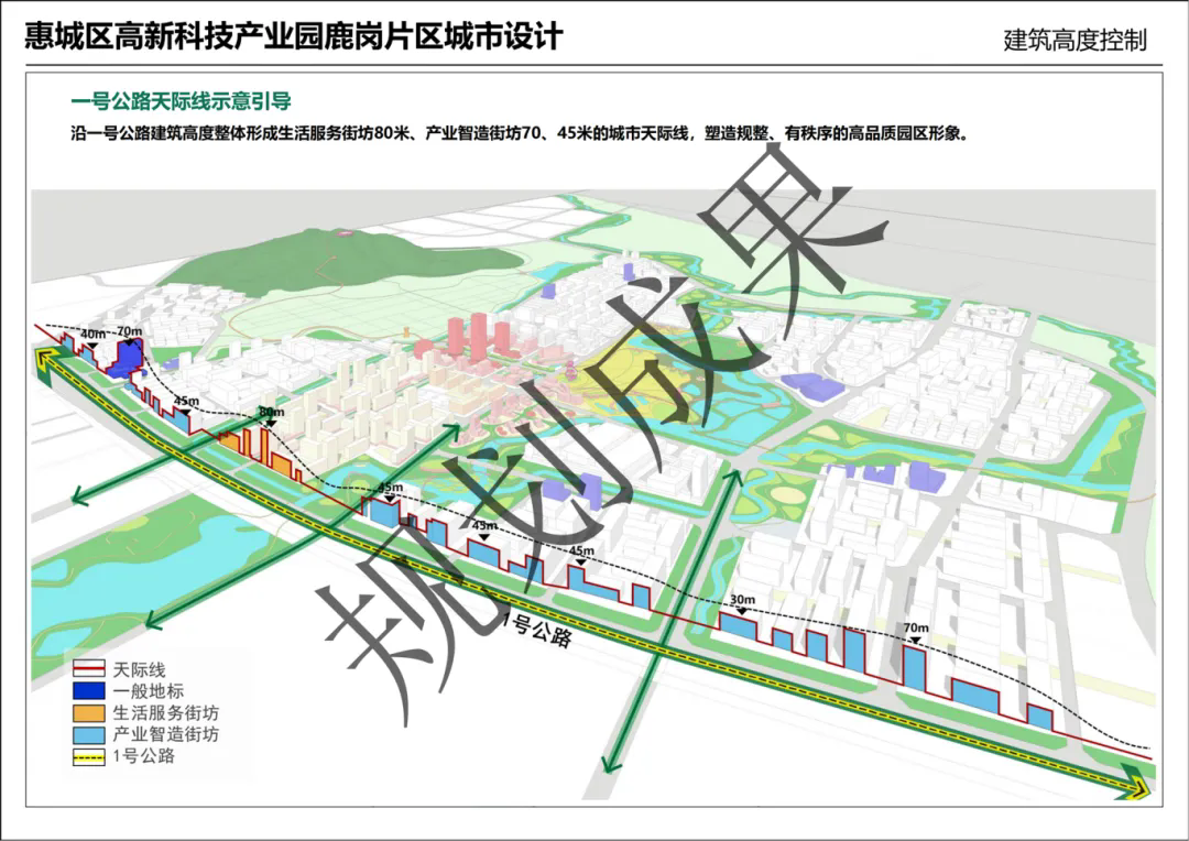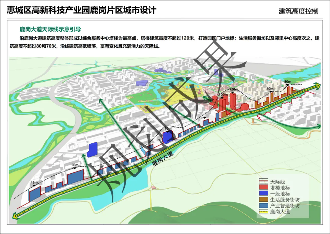 綜合服務(wù)中心標(biāo)志性建筑高度控制≤120米,鹿崗三路及柏田水兩側(cè)商業(yè)及公共服務(wù)設(shè)施用地建筑高度控制≤40米;其他商業(yè)地塊建筑高度控制為≤70米。