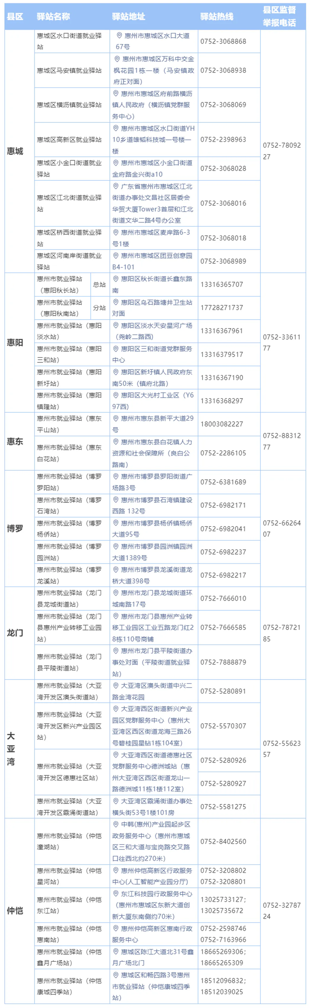 惠州市就業(yè)驛站已建成站點一覽表