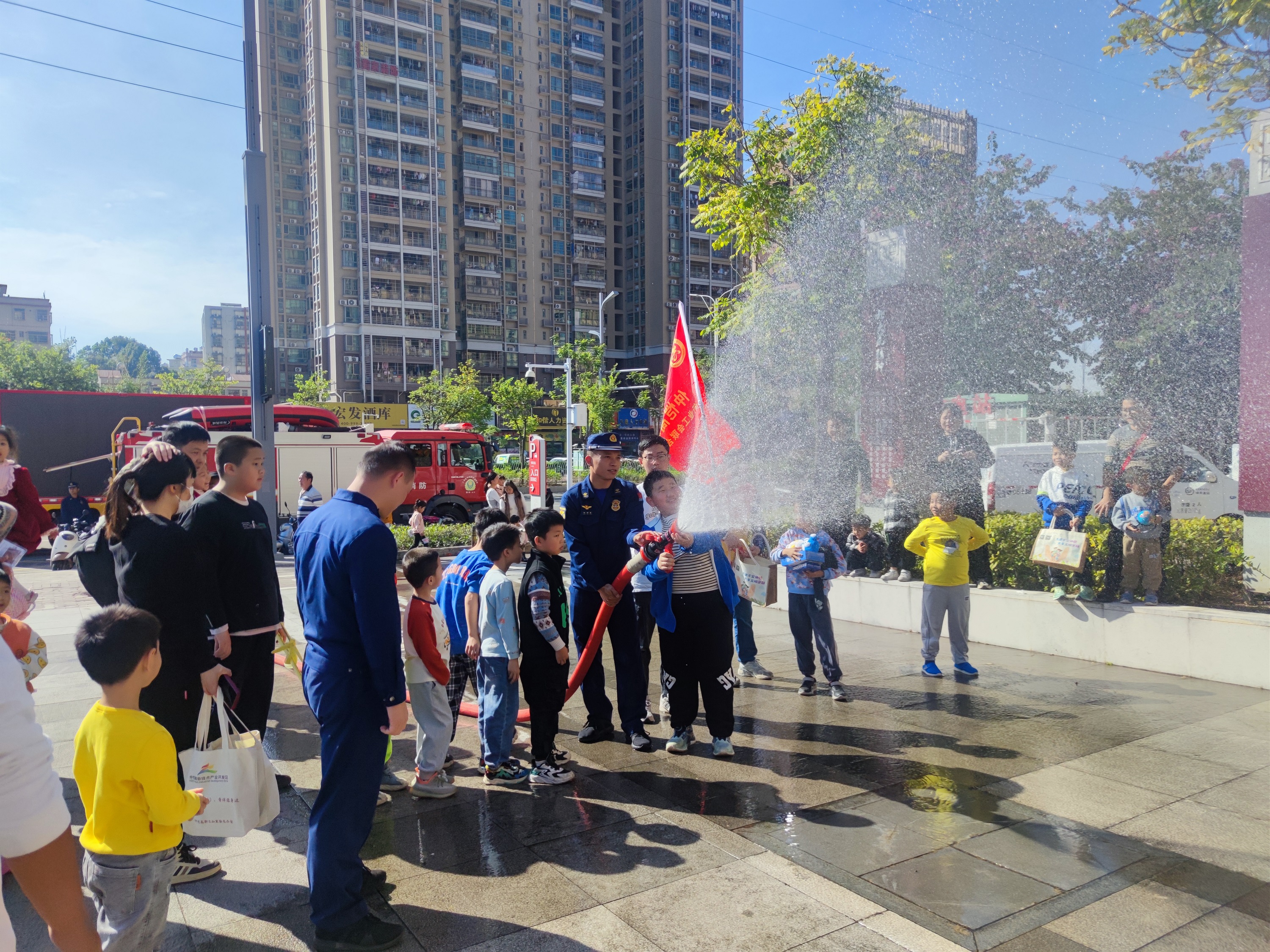 活動(dòng)設(shè)置消防知識(shí)科普,小朋友排隊(duì)體驗(yàn)消防設(shè)施。