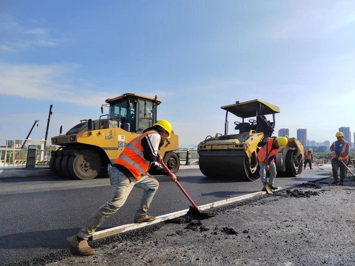 瀝青攤鋪是大橋通車前的重要工序。鵝城大橋主橋瀝青攤鋪長度460米,施工采用2臺攤鋪機(jī)、3臺雙鋼輪壓路機(jī)、20臺自卸拉料車協(xié)同有序作業(yè)。為確保安全施工,項目部精心組織,細(xì)化施工任務(wù),安排專人到瀝青攪拌站實時盯控,強(qiáng)化原材料監(jiān)管,F(xiàn)場技術(shù)人員針對瀝青溫度、厚度、平整度、壓實度等各項指標(biāo)層層把關(guān),精準(zhǔn)控制每一道施工關(guān)鍵環(huán)節(jié),確保施工進(jìn)度和鋪裝質(zhì)量。