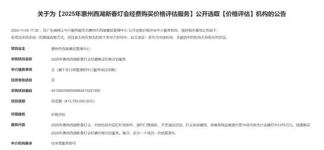 發(fā)布《關(guān)于為【2025年惠州西湖新春燈會經(jīng)費(fèi)購買價(jià)格評估服務(wù)】