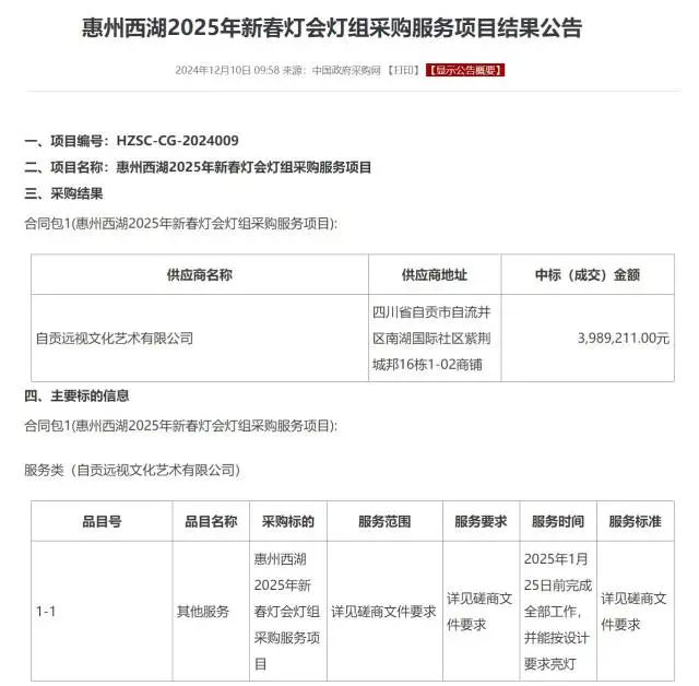 2024年新春,農(nóng)歷臘月二十八日(2024年2月7日)西湖花燈亮燈閃耀全城。2025年新春花燈又將何時(shí)點(diǎn)亮?據(jù)中國政府采購網(wǎng)發(fā)布的最新信息顯示,當(dāng)前,自貢遠(yuǎn)視文化藝術(shù)有限公司已正式以3989211元的價(jià)格成功中標(biāo)惠州西湖2025年新春燈會燈組采購服務(wù)項(xiàng)目,合同約定在2025年1月25日前完成全部工作,并能按設(shè)計(jì)要求亮燈。